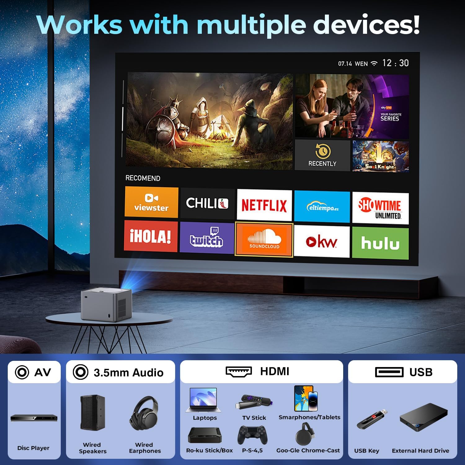 【Multi-Connection & Professional After-Sales】This home theater proyector is equipped with HDMI,USB,AV, interfaces. This wide range of ports makes it compatible with various devices like TV sticks, games, smartphones, laptops, DVD players, and more. We provide professional and friendly service–if you are not completely satisfied, we will be glad to provide a replacement or refund.