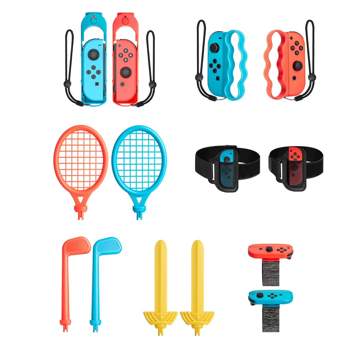 16-in-1 Switch Accessories Kit for Joy-con: This Switch accessories kit includes: Tennis Rackets x 2, Swordplay Grip x 2, Golf Club x 2, Wrist Strap x 2, Football Leg Strap x 2, Boxing Grips x 2, Joycon Split Handles x 2, Card Box x 1, Organizer Stand x 1, organize all sports equipment and keep the playground neat and tidy. Saves your money and time searching for single accessories, so you really get good bang for your buck.