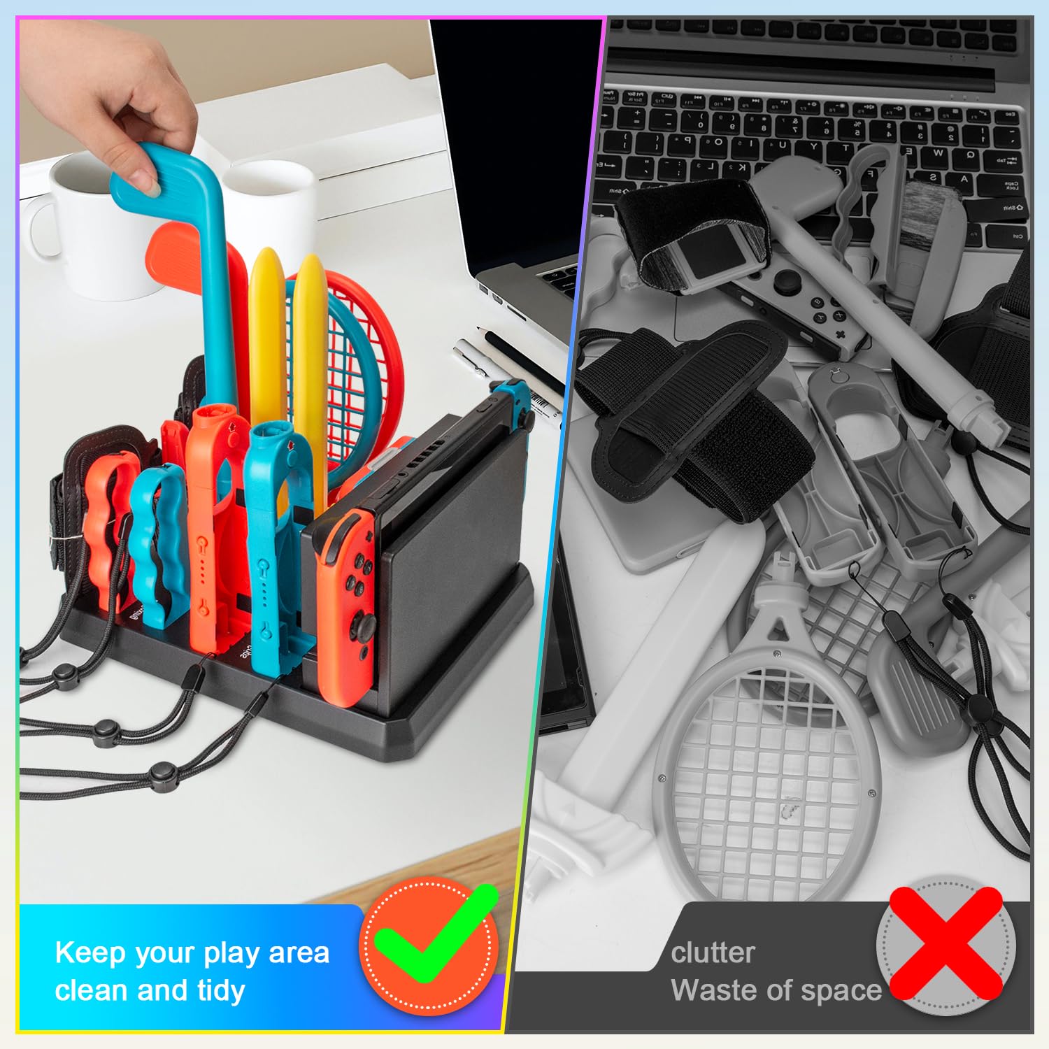 The switch sports accessories comes with 1 organizer stand, can organize all accessories into the stand, say goodbye to mess, keep your desk clean and easy to find!