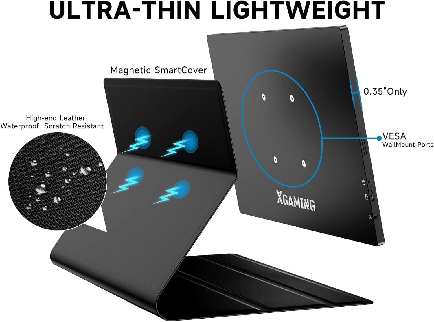 [Smart Cover,VESA,Speakers] The portable gaming monitor with a scratch-proof smart cover,with 2 grooves for folding as a stand.75x75mm VESA holes (M3*5mm) on the back allowing you to mount the monitor to a desktop or wall,eliminate cable clutter and save valuable space for your gaming and work station.Built-in speakers,provide you booming sound with crystal clear audio quality when watching videos and playing games.