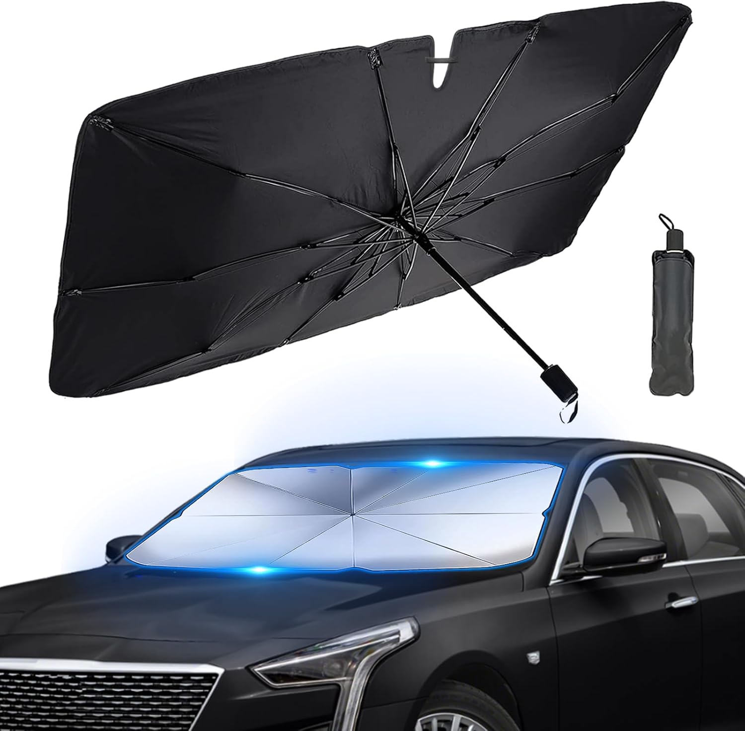 【Portable Folding】This foldable front window sunshade is easy to use and opens like an umbrella with just one push! The folding design makes the car windshield sunshade easy to store and carry, and comes with a nylon buckle and leather storage bag that can be easily stored in the car door locker for easy access.