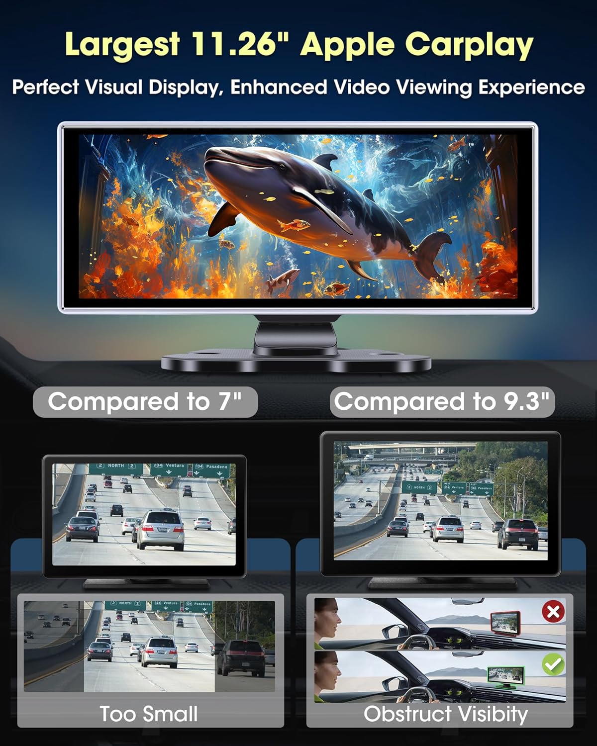 【Largest 11.26” Apple Carplay Screen】Apple Carplay Screen for Car adopt 11.26” Largest touch screen in the carplay market, offers crystal-clear clarity for an enhanced video viewing experience. Giving you a larger-than-life visual display to ensure you can access Maps navigation, Music, calling, email and other available apps without clogging up your interior, making your drive more convenient and enjoyable