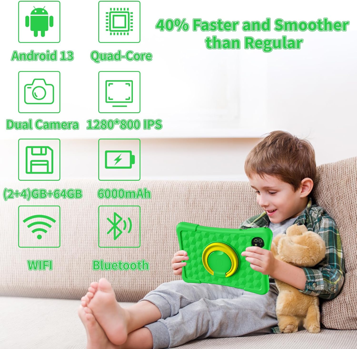 【Latest Android 13 Kids Tablet with 2.0GHz 4-Core Processor】Equipped with an enhanced Android 13 system, a rapid 2.0GHz 4-core processor, 6GB (2+4)GB RAM, and 64GB storage (expandable to 1TB), this 10-inch kids tablet meets diverse learning and entertainment needs. Android 13 ensures a user-friendly interface with a focus on privacy protection, accompanied by kid-friendly themes and easy operations. Backed by Google GMS certification.