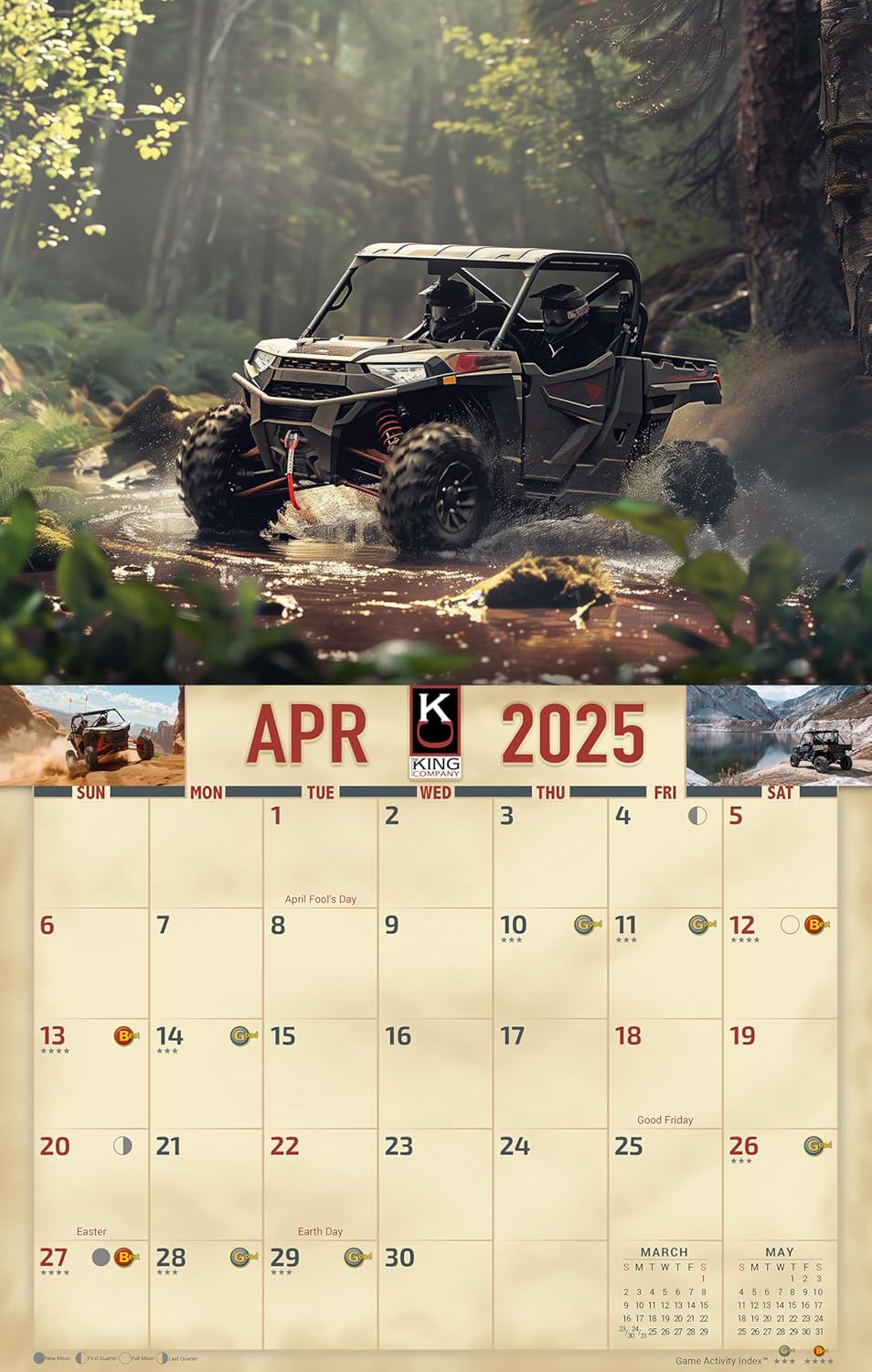 SXS, or side-by-side, UTV (utility terrain vehicle) wheeling offers an exhilarating blend of adventure and utility, providing enthusiasts the means to explore rugged terrain and conquer off-road challenges. Behind the wheel of these versatile vehicles, riders navigate diverse landscapes, from rocky trails to sandy dunes, with ease and confidence. With features like four-wheel drive, suspension systems, and durable construction, SXS vehicles are built to tackle the toughest terrain, offering a smooth and stable ride even in the most demanding conditions. Whether embarking on solo adventures or joining group excursions, riders experience the thrill of off-road exploration while enjoying the comfort and convenience of their UTVs. SXS wheeling isnÕt just about conquering obstaclesÑitÕs about forging connections, creating memories, and experiencing the freedom of the open trail with friends and family. Beyond the adrenaline rush, SXS wheeling fosters a sense of camaraderie among enthusiasts who share a passion for adventure and a love of the great outdoors. Whether navigating rocky terrain or splashing through mud pits, SXS wheeling offers an immersive off-road experience that allows riders to connect with nature and embrace the spirit of adventure. All of the incredible images in this calendar were created using a combination of AI and digital artwork by The King Company.
