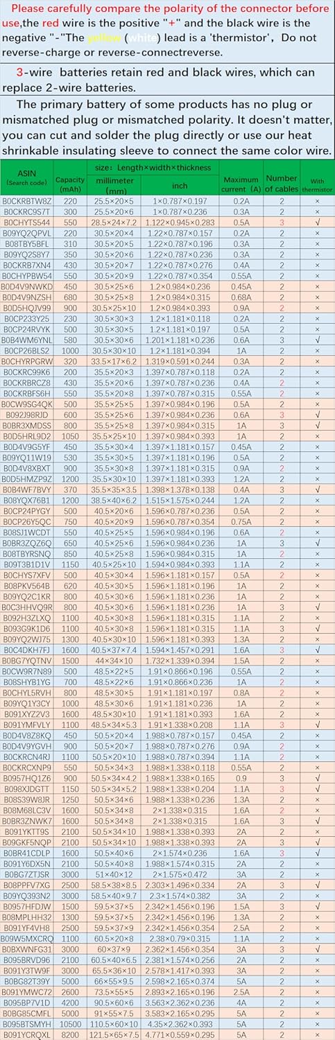 Please carefully compare the polarity of the connector before use,★the red wire is the positive “+” and the black wire is the negative “-“Yellow is thermistor “NTC”,Do not reverse-charge or reverse-connectreverse. ★The primary battery of some products has no plug or mismatched plug or mismatched polarity. It doesn’t matter, you can cut and solder the plug directly or use our heat shrinkable insulating sleeve to connect the same color wire.