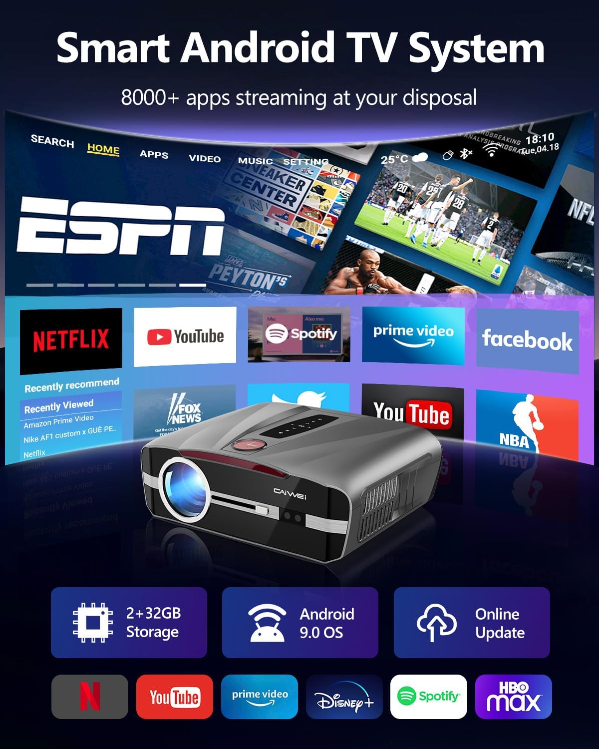 【Faster WiFi 6 & Bluetooth, Massive Apps】Powered by WIFI 6 and 5G/2.4G WIFI, this wifi 4k projector provides more stable and smoother transmission. New NFC tech, one touch to effortlessly cast and control the projector with your smartphone/tablet. With 2+32G large storage, android OS brings all the features of smart TV right to your fingertips, getting easy access to thousands of apps, such as Netflix, Prime Video, Disney+ etc. Hooks up speakers for a truly immersive audio experience via BT5.2.