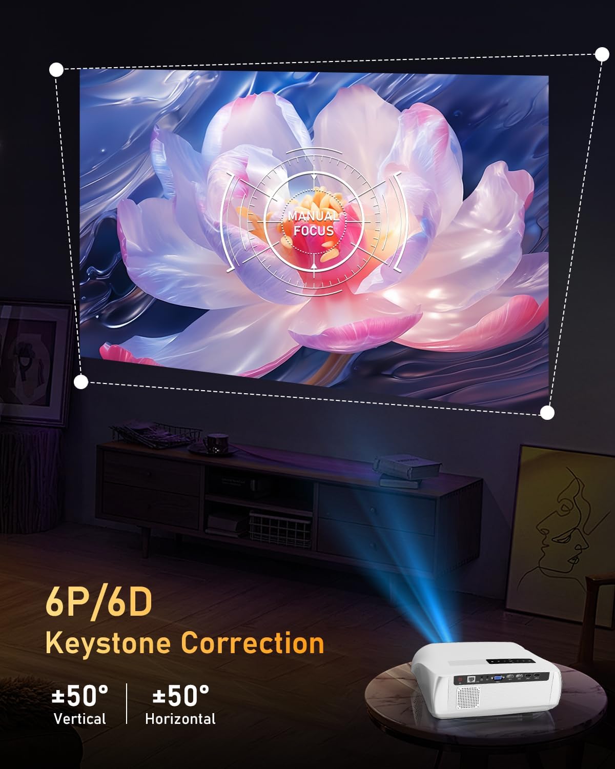 【6P/6D Keystone correction/300″ Display】After opening the projector, easily get a clear and aligned image! The 4K projector uses an advanced 6P/6D Keystone correction. You only need to gently adjust the wheel, and the projector can accurately detect the real -time motion and adjust the screen accordingly to ensure that the picture is clear. The projector support the projection screen of 50″-300″(need to move the projector), which flexibly meet your needs for the size of the picture.