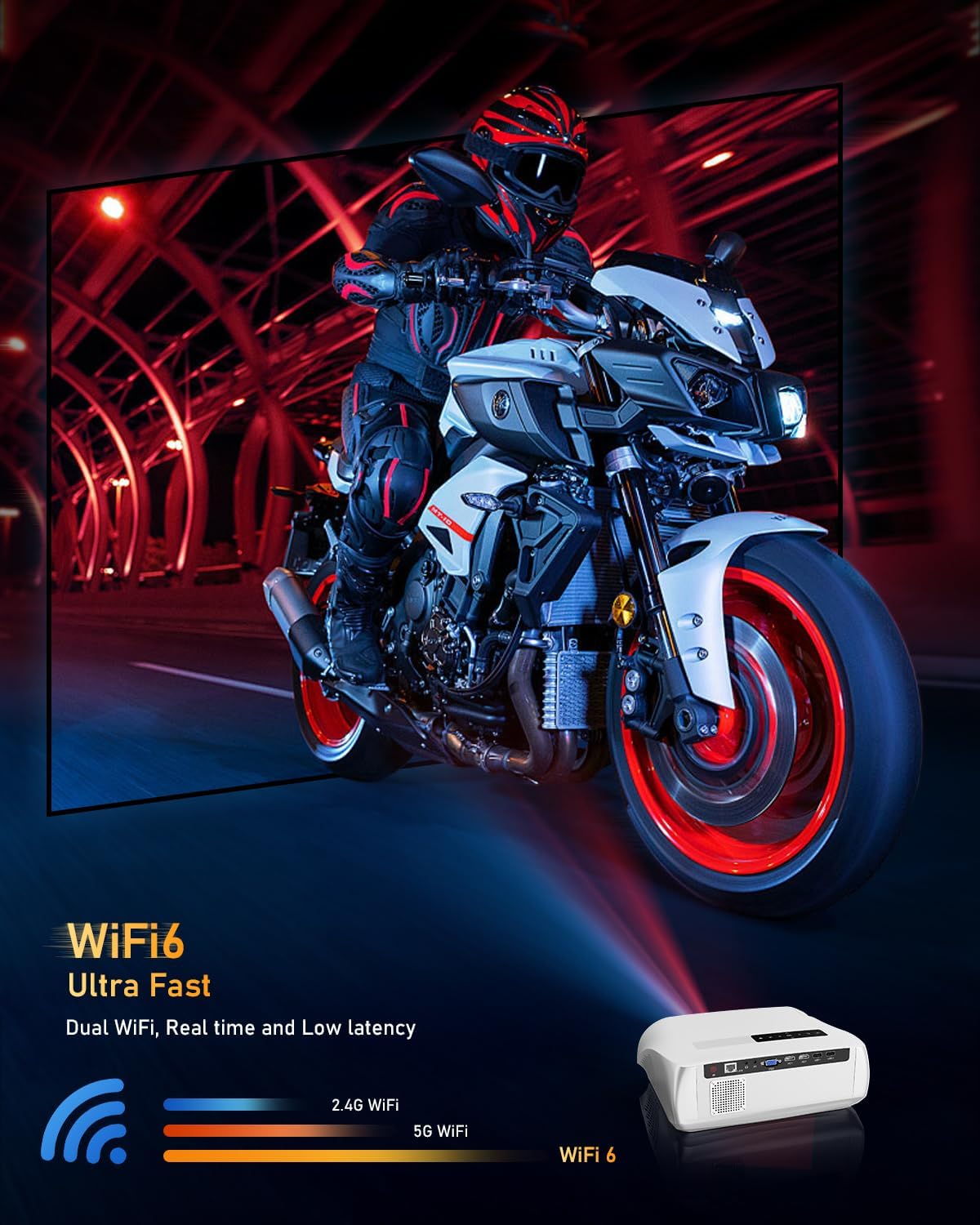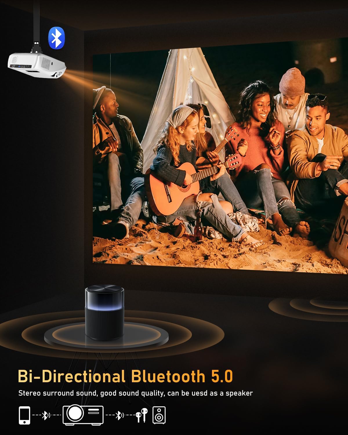 【WIFI 6/Two-way BT 5.0】Using the latest WIFI 6 tech, it can also run on 5G/2.4G wifi. It has strong anti -interference capabilities to ensure rapid and stable transmission. The two -way Bluetooth 5.0 technology allows video projectors to be used as independent Bluetooth audio, while connecting external audio to create an immersive sound. And built-in Hi-fi stereo speakers with double diaphragm design. provide a crispy treble and bass output, which truly provides the theater experience.