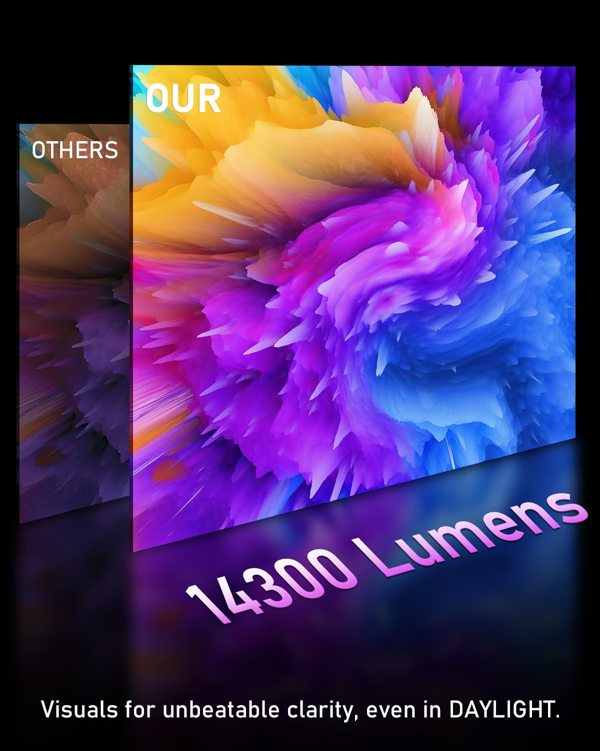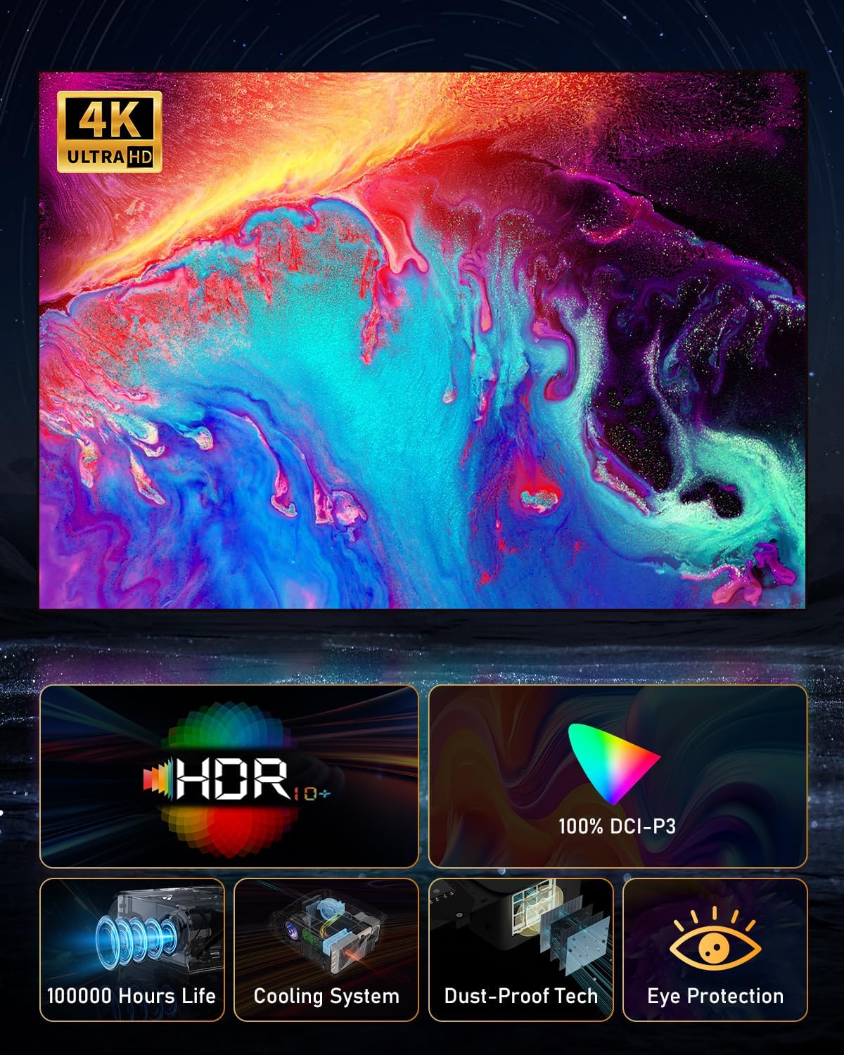 【Daytime Bright 4K UHD Projector】All-New 4K home projector produce cinematic HDR picture quality for unparalleled visual enjoyment. And the high contrast of 16000: 1, you can clearly see the details of the shadow or strong light. Coupled with the brightness of 1100ASIN/14300 lumens, it enhances image quality when streaming all your movies, even during the daytime. This is the projector that can replace your TV for ultimate entertainment.