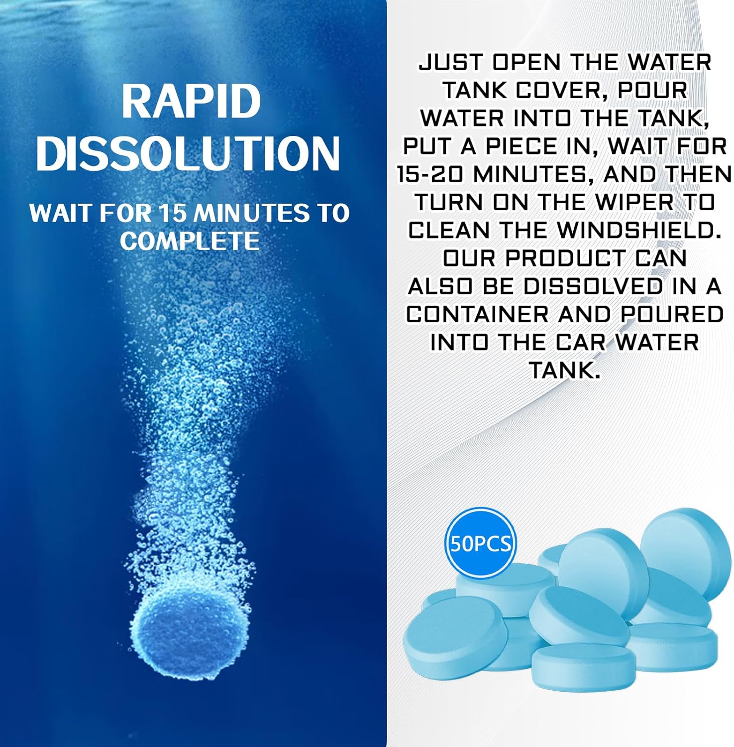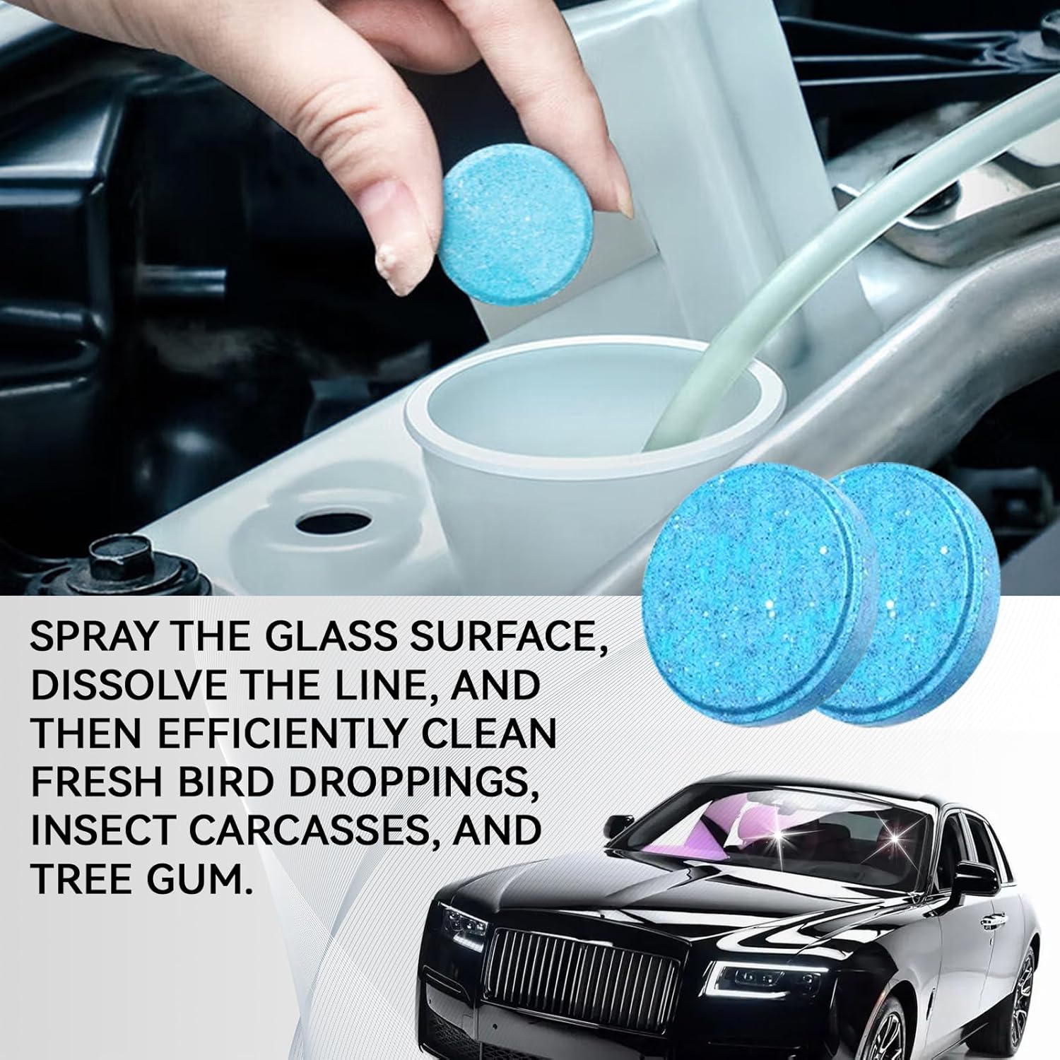【How to use】First open the water tank cover. Then pour water into the water tank and add 1 cleaning tablet. Wait 15-20 minutes and finally turn on the wipers to clean the windshield. (If conditions permit, this product can be dissolved in a container and then poured into the car water tank.)