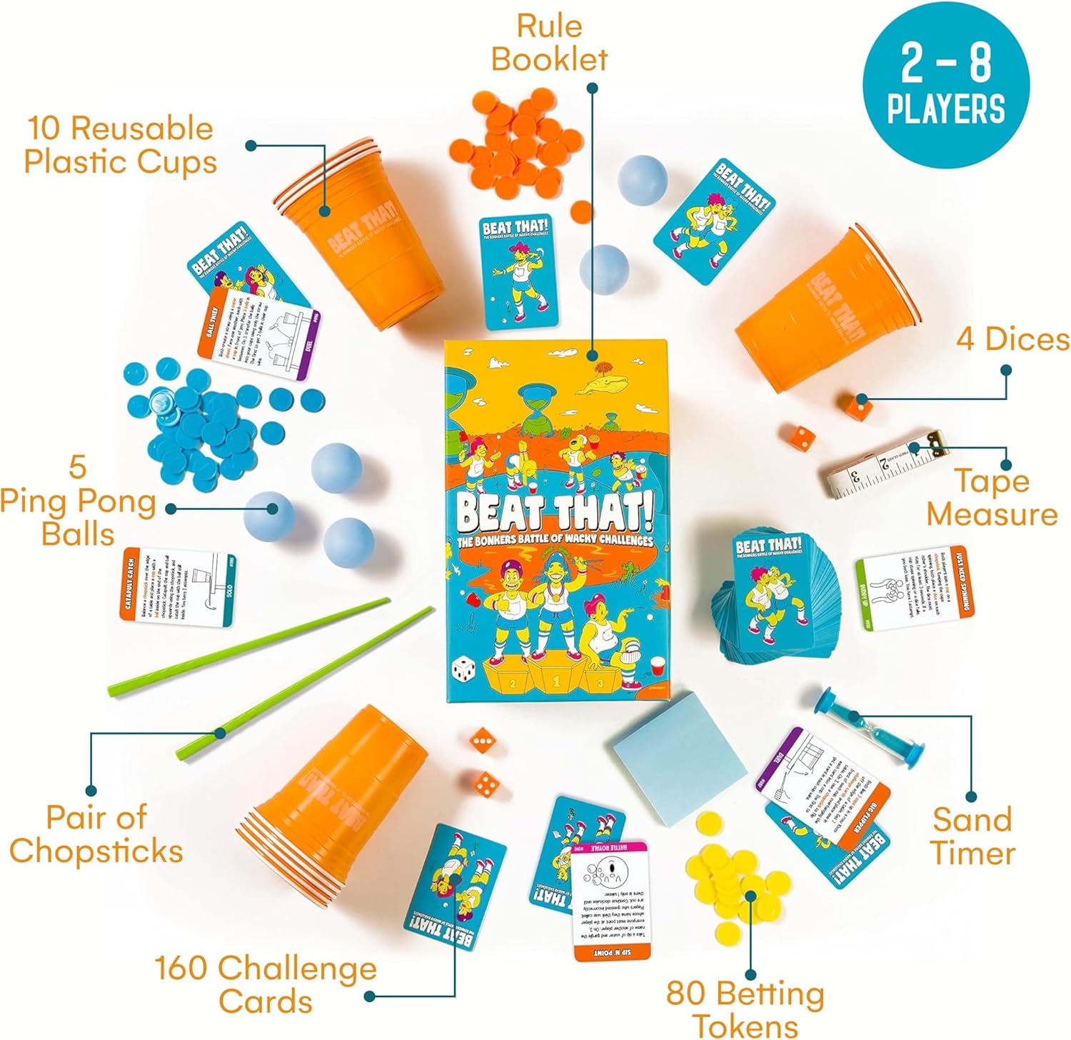 Beat That! takes just 2 minutes to learn. A typical game lasts around 40 minutes, however, with 160 challenge cards in total, you and your friends could battle it out until the sun comes up. Suitable for ages 9+ and recommended for 2-8 players.