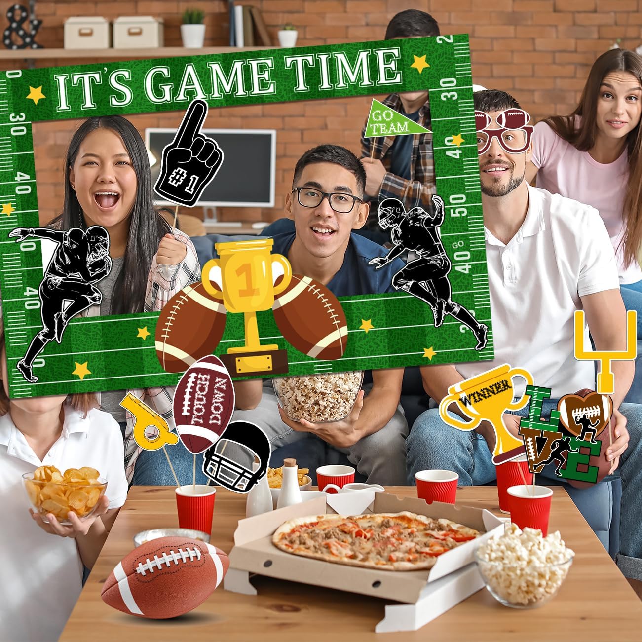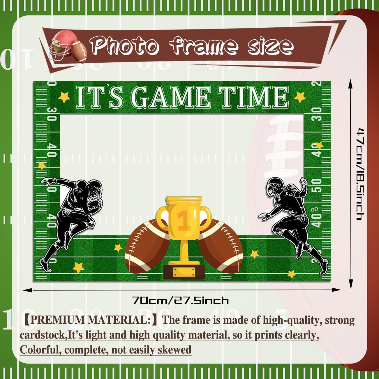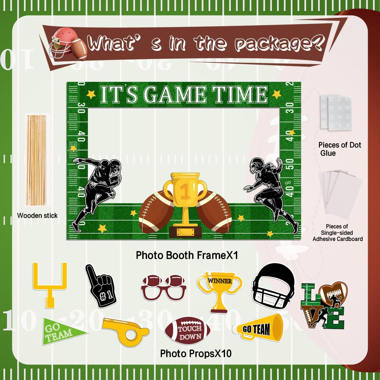 🏈Super Bowl Game Day Decorations- Package includes a 18.5*27.5” IT’S GAME TIME photo booth frame and 10 kinds of football-themed props such as helmets, jerseys, goal posts, and more. These football photo booth props could be used as photo props, they can also be used as cake toppers, banners, vase centerpieces, etc.