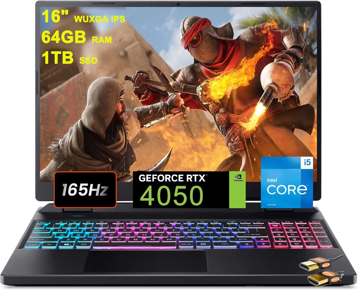 Acer Predator Helios 300 Gaming Laptop features a 16″ WUXGA (1920 x 1200) IPS 165Hz Display. The dedicated NVIDIA GeForce RTX 4050 6GB Graphic ensures smooth visuals and an immersive gaming experience Powered by an 13th Gen Intel 14-Core i5-13500HX Processor, the laptop delivers high-performance computing for gaming and multitasking With 64GB of RAM, you can expect seamless multitasking and smooth gameplay. The laptop is equipped with a 1TB SSD, providing ample storage space for your games, files, and multimedia content It comes pre-installed with Windows 11 Home, offering a user-friendly interface and access to a wide range of applications. The RGB backlit keyboard allows you to game or work in low-light conditions. Experience immersive audio with DTS:X ULTRA technology