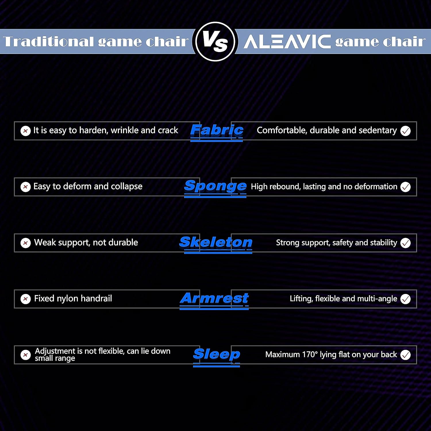 【MULTIFUNCTIONl GAMING CHAIR】 ALEAVIC gamer chair swivels 360 Degree, height adjustable, can be locked at any angle between 90-170 degrees backwards. The armrest can be and down; The interior of the seat, backrest, and lumbar support is padded with premium high density sponge that won’t easily deform. Suitable for adults and teens, Upgraded LANT gas cylinder and mechanism ensure the use age of the computer gaming chair.