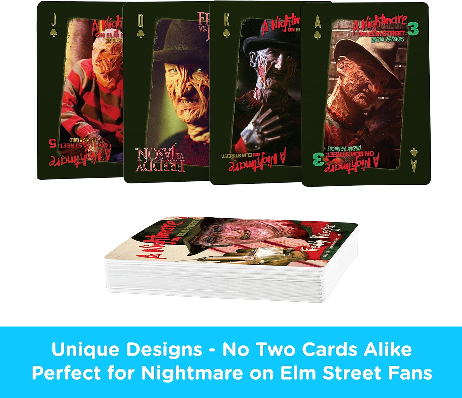 UNIQUE DESIGN ON EVERY CARD: This A Nightmare on Elm Street deck of playing cards includes 54 cards (52 playing cards and 2 jokers). Every single playing card features its own distinct NOES themed design and art. No two cards are alike