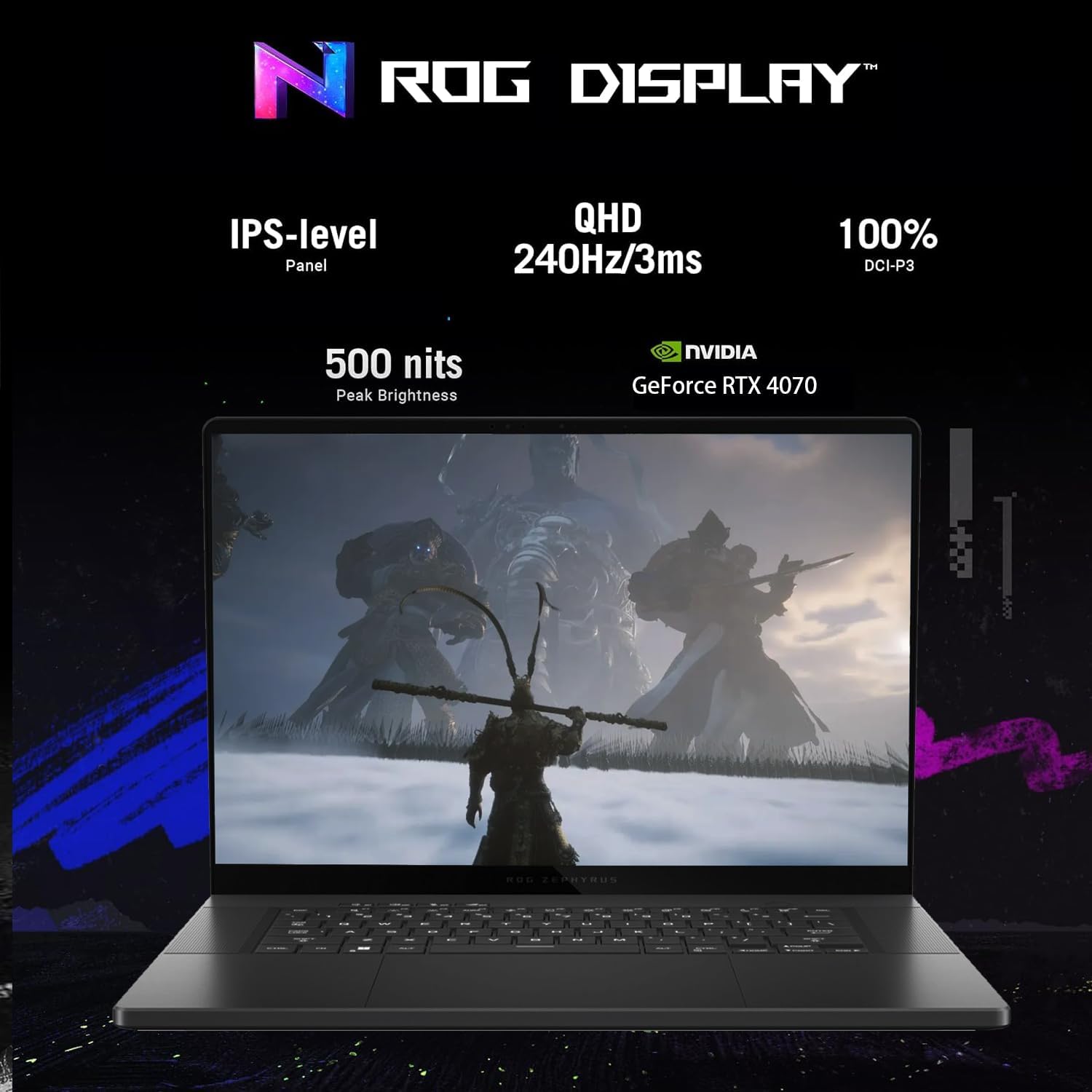 ASUS ROG Zephyrus Intel Ultra 9 RTX 4070 High-End Gaming Laptop, 16″ WQXGA 2560 x 1600 240Hz, Intel Ultra 9 185H, NVIDIA GeForce RTX 4070, 16GB RAM, 1TB SSD, with A-Data 512 External SSD Bundle
