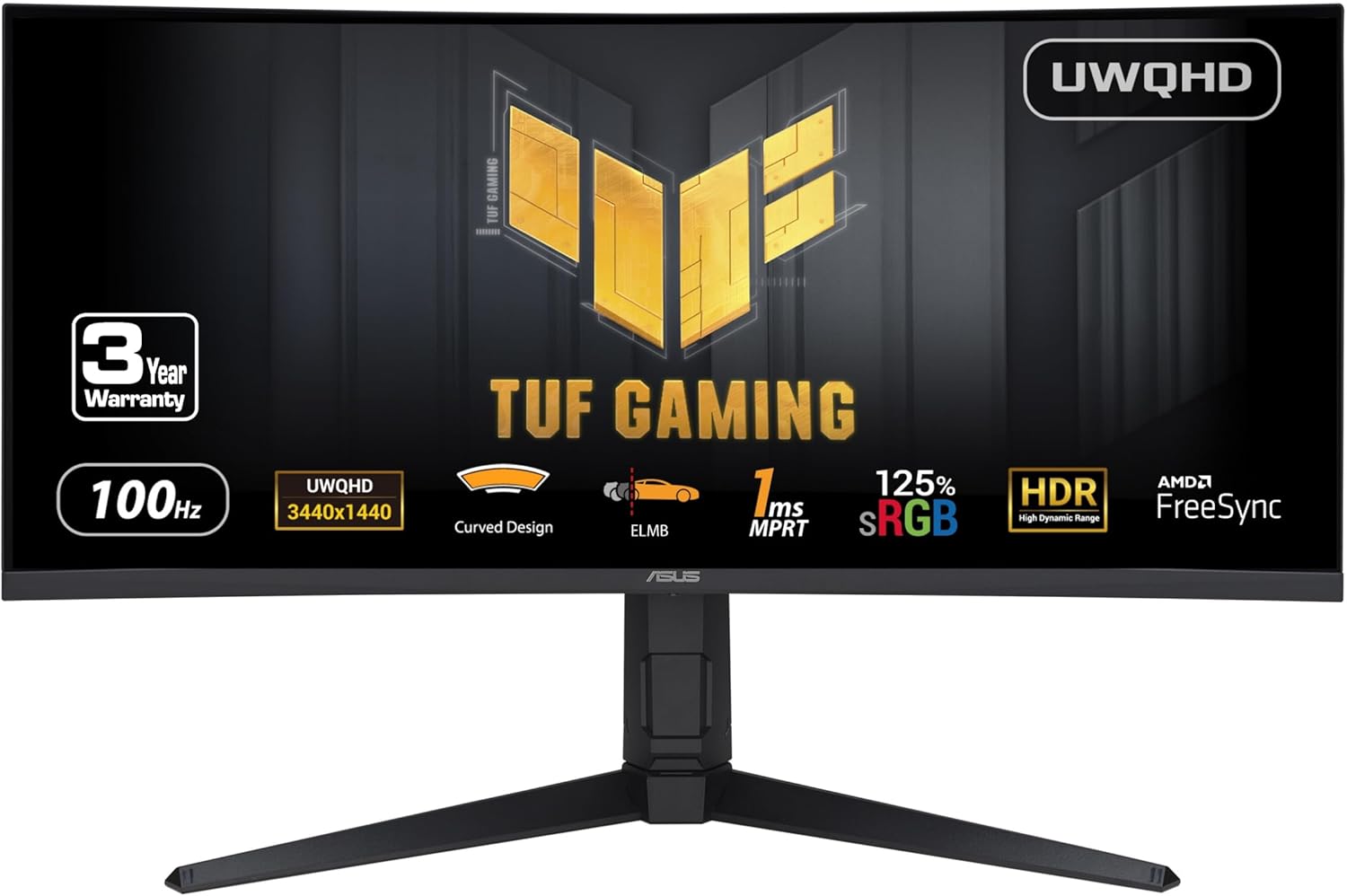 TUF Gaming VG34VQEL1A is a 34-inch Ultra Wide QHD (3440 x 1440) 1500R curved gaming monitor with an 100 Hz refresh rate and 1 ms (MPRT) response time for extremely immersive gameplay. It features exclusive Extreme Low Motion Blur (ELMB) technology and AMD FreeSync™ to eliminate ghosting and tearing. In addition, it also features High Dynamic Range technology, supporting the HDR10 format and covering 125% of the sRGB color gamut for great contrast and lifelike colors.