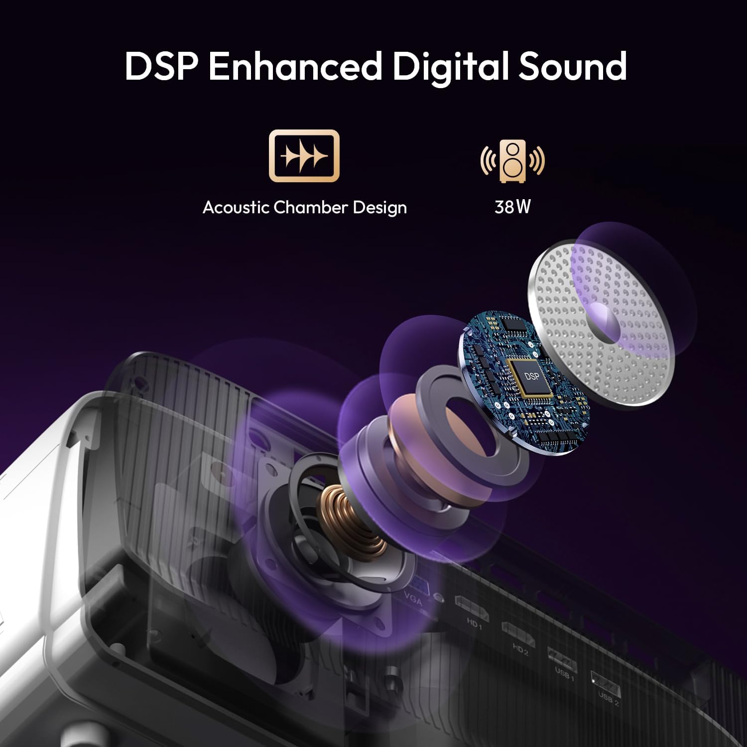 【Auto Focus Projector+Auto 6D Keystone】Achieve a clear, perfectly aligned image effortlessly with our smart 4K projector. Utilizing advanced single anti-focus technology, a 30W camera gyroscope, and sensors, this projector accurately detects real-time motion and adjusts the picture to ensure optimal clarity. Say goodbye to manual adjustments. The ultra hd projector features autofocus and auto-trapezoid technology (±50° horizontal, vertical), making it easy to set up for movies or games.