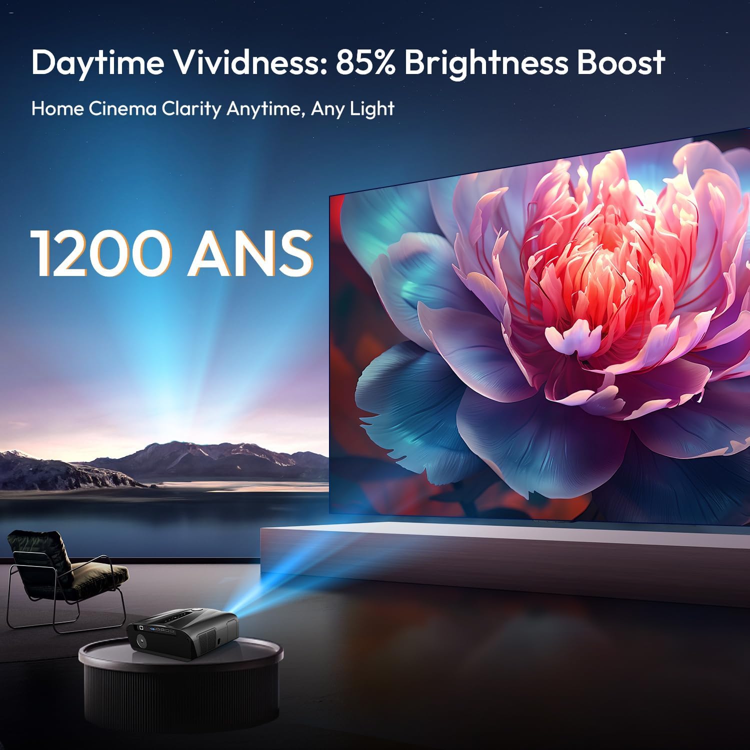 【4K Daytime Projector & 1200 ANSI Lumen】Experience peak visual quality with EUG latest advanced WiFi projector. The LCD projector utilizes latest AI optical algorithms, paired with German high-transmittance lens, delivering an impressive 1200 ANSI lumens of brightness. It improves image clarity and rich color spectrum, resulting in 16000:1 color fidelity. Tailored to perform well in both indoor and outdoor environments, it is a testament to uncompromising quality and performance.