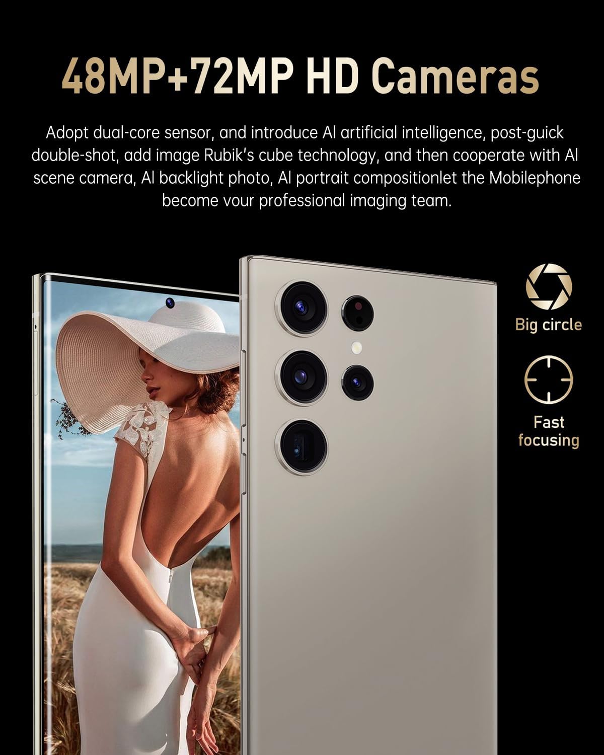 👍【6800mAh Long Lasting Battery Life】S24U 5g unlocked smartphone with a 6800mAh battery and own battery saving technology, you can enjoy up to 5 hours of video playback, 30 hours of music playing time, everything you want to do is supported by it. Equipped with 20W charging, it can charge quickly when you needed. The dual sim phone with 48MP+72MP camera to meet daily needs