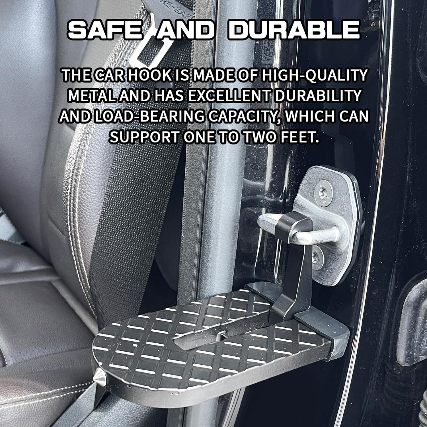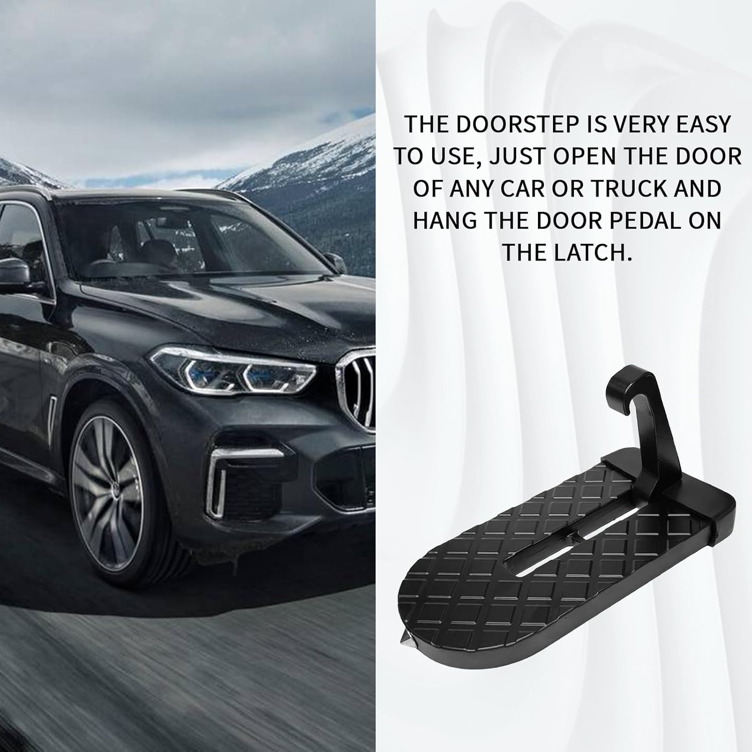 【Easy to Use】This car step hook is very easy to use, just like a mini ladder, just open any of your car or truck door and then hang it on your door latch, the door step has a textured, non-slip surface and will not damage your door or door latch.