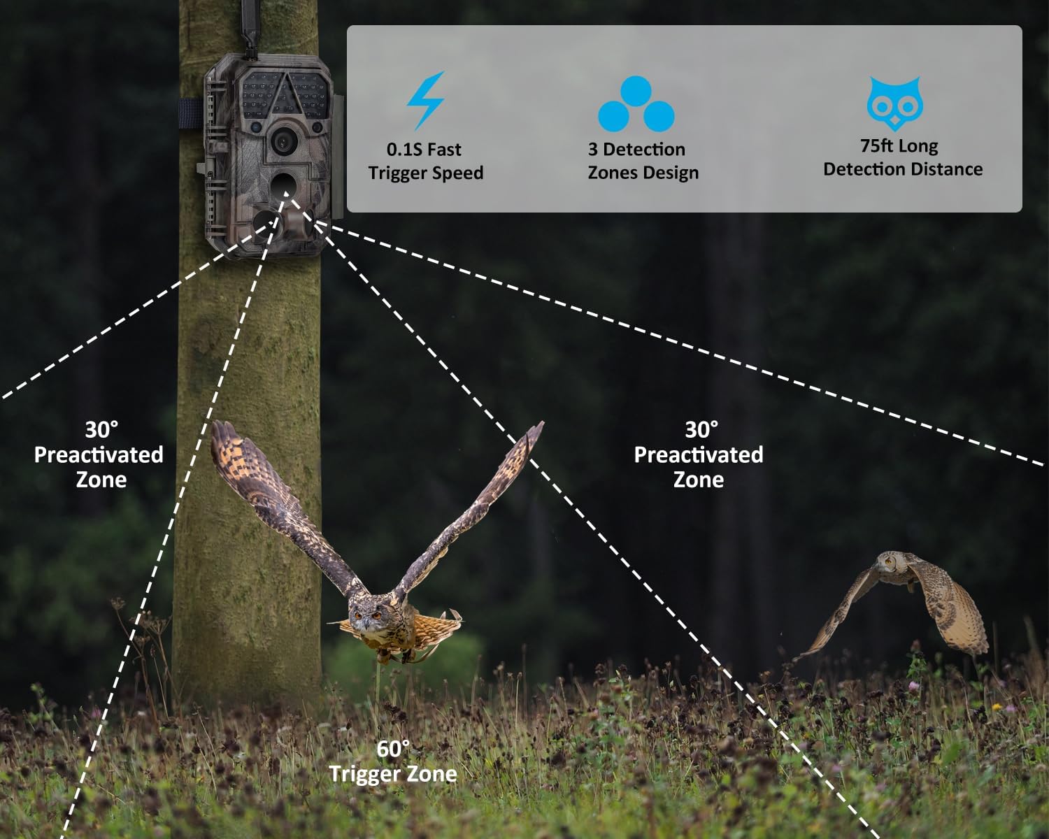 3 PIR sensor designed and pre-activated technology for ultra-fast 0.1s trigger speed, and fast system-level optimization for 0.5s recovery time. You won’t miss fast-moving animals. It is idea for deer season, hunting, wildlife scouting or security purpose.