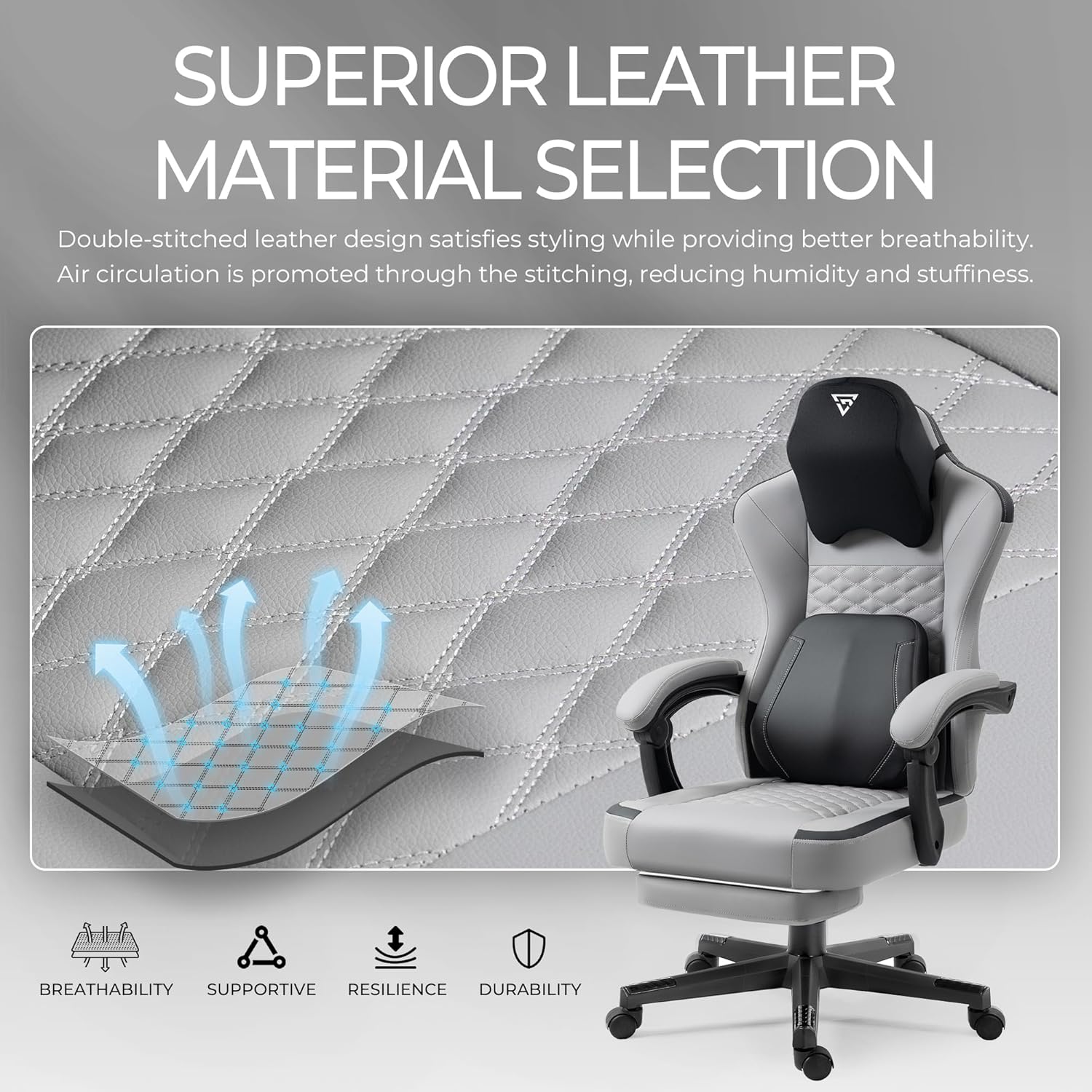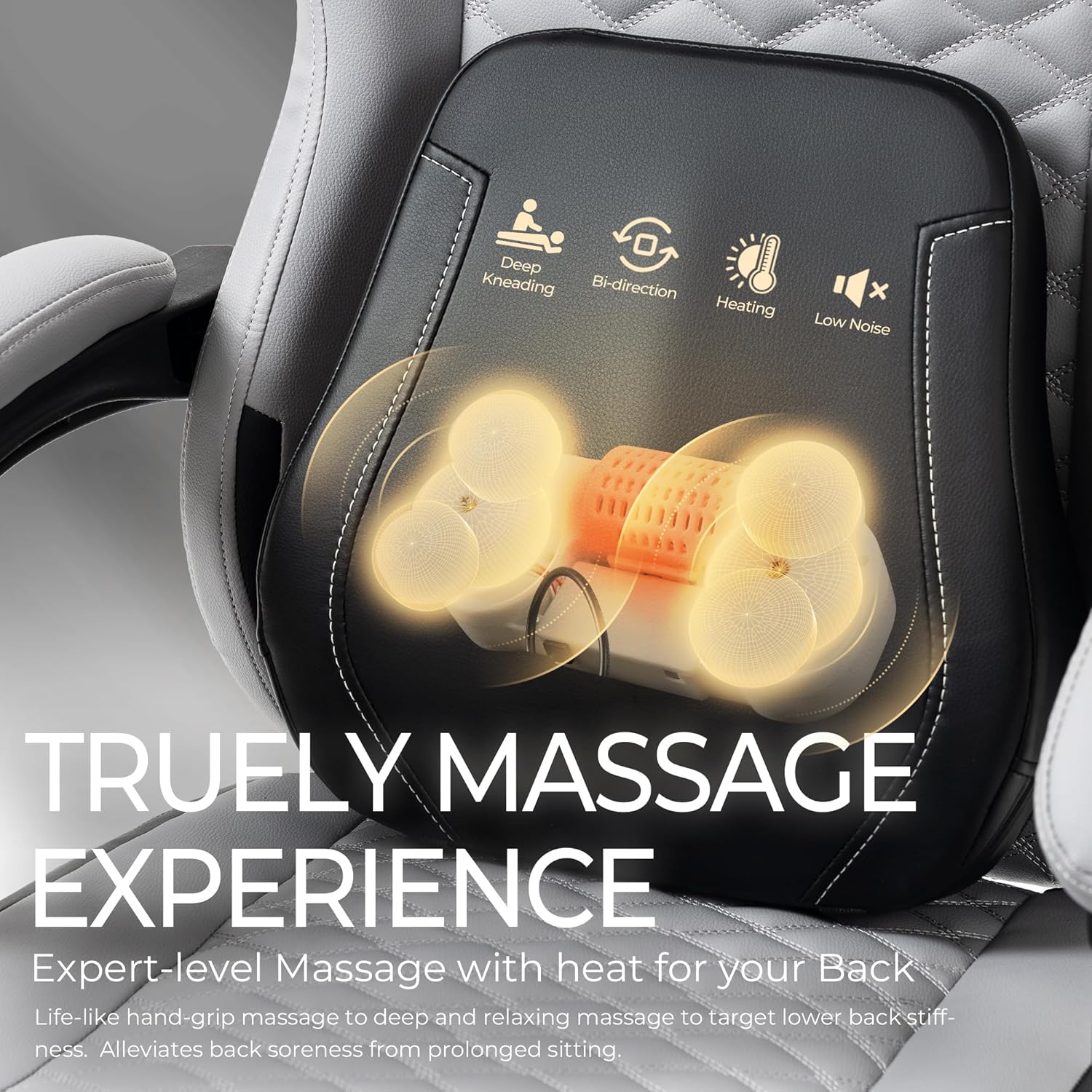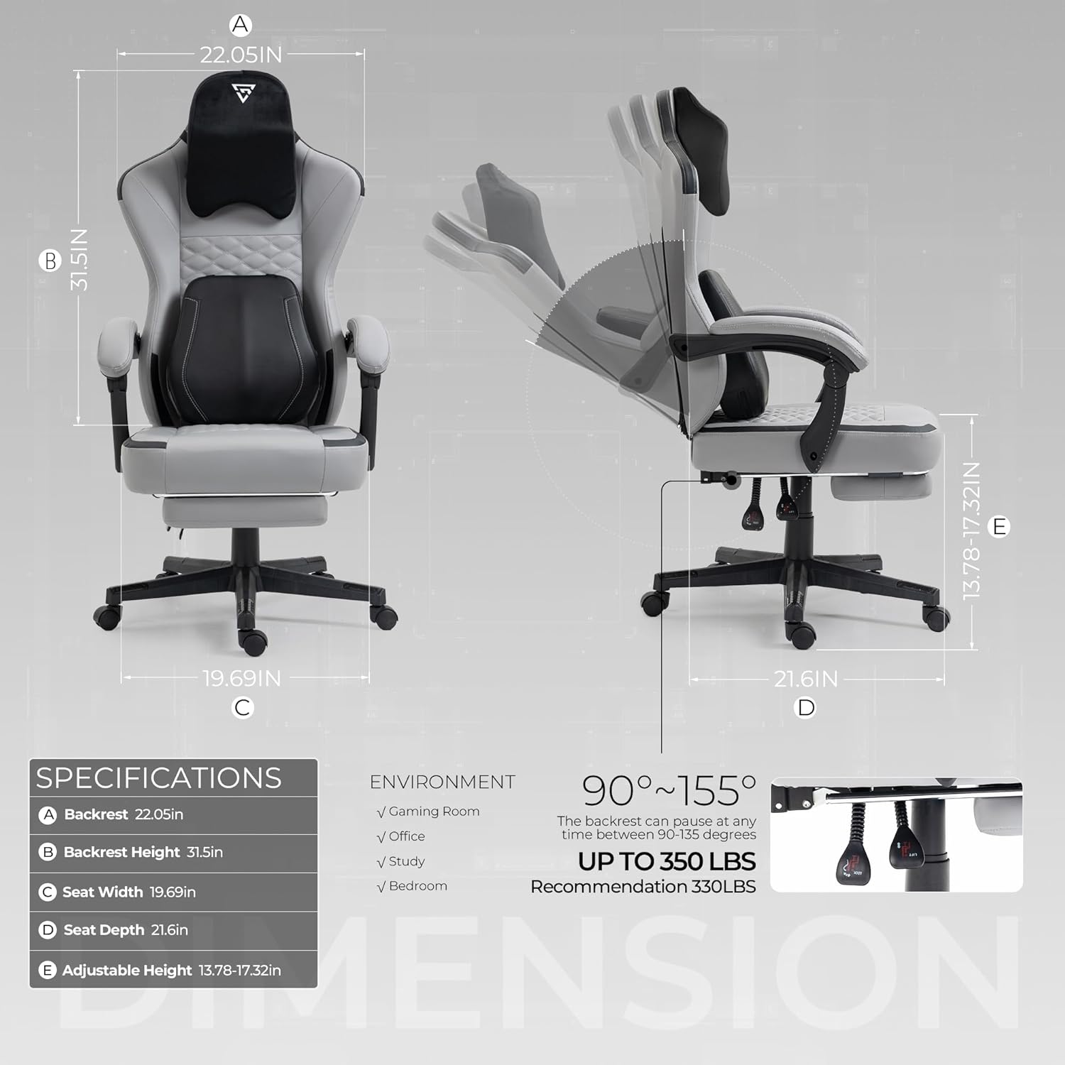Computer Gaming Chair with Massage Lumbar Support for Heavy People Adults, Ergonomic Reclining Adjustable Swivel Task Chair with Footrest (Grey)