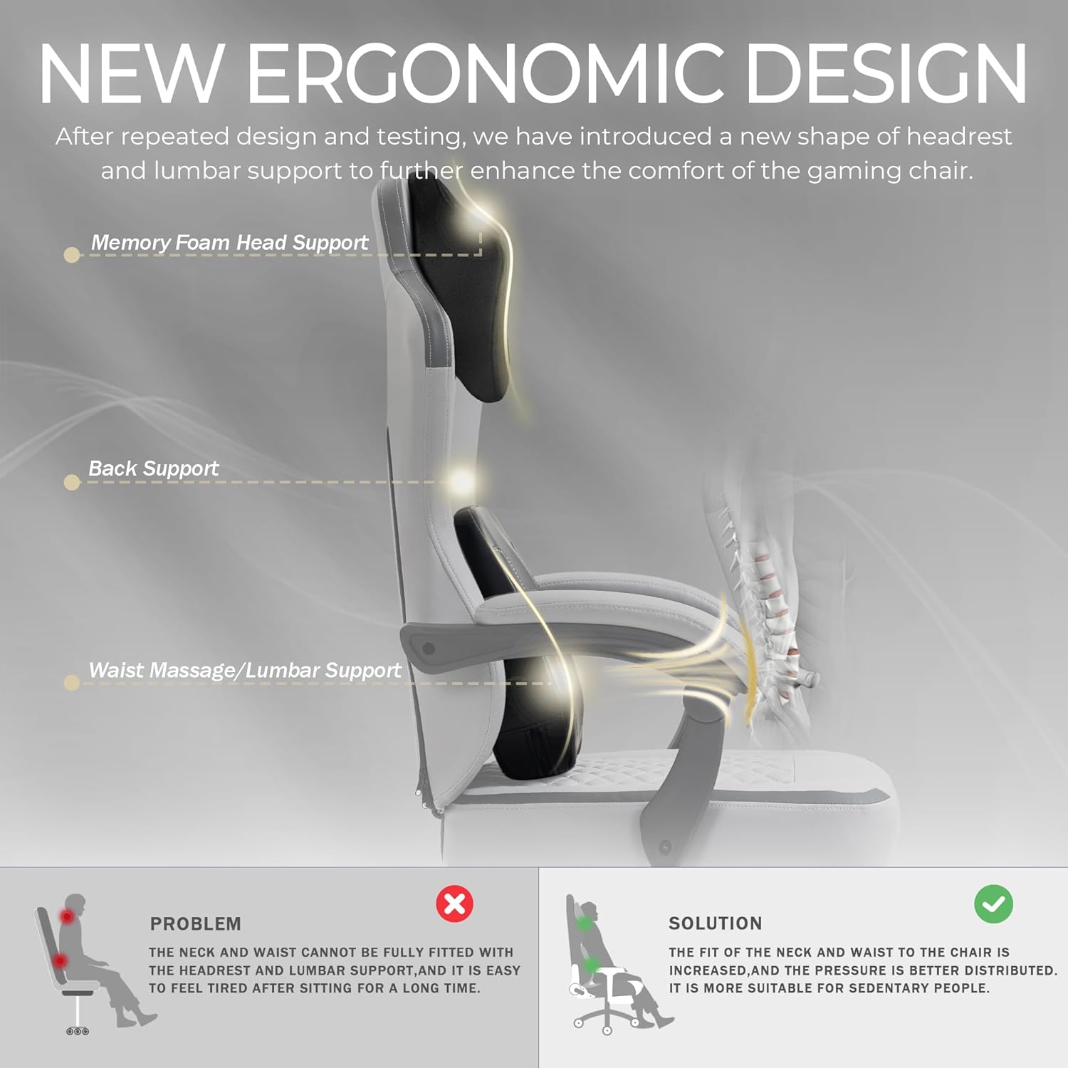 【MULTI-FUNCTIONAL GAME CHAIR】Are you looking for a chair that can actually relieve sedentary fatigue? Our ergonomic gaming chair is equipped with soft headrest, high-quality cotton velvet and unique shape to provide better support and wrapping. Adjustable massage lumbar pillow maximizes spine and lumbar support, and retractable footrest allows you to fully recline and relax, truly relieving comfort and enjoying leisure.