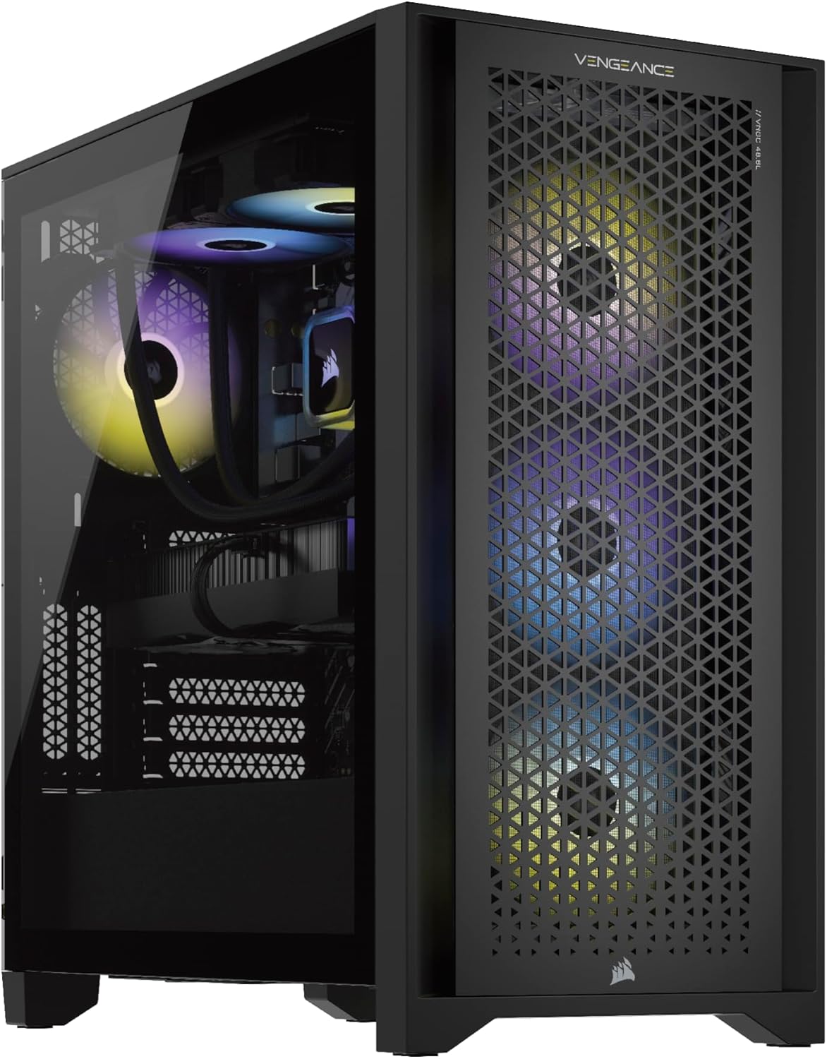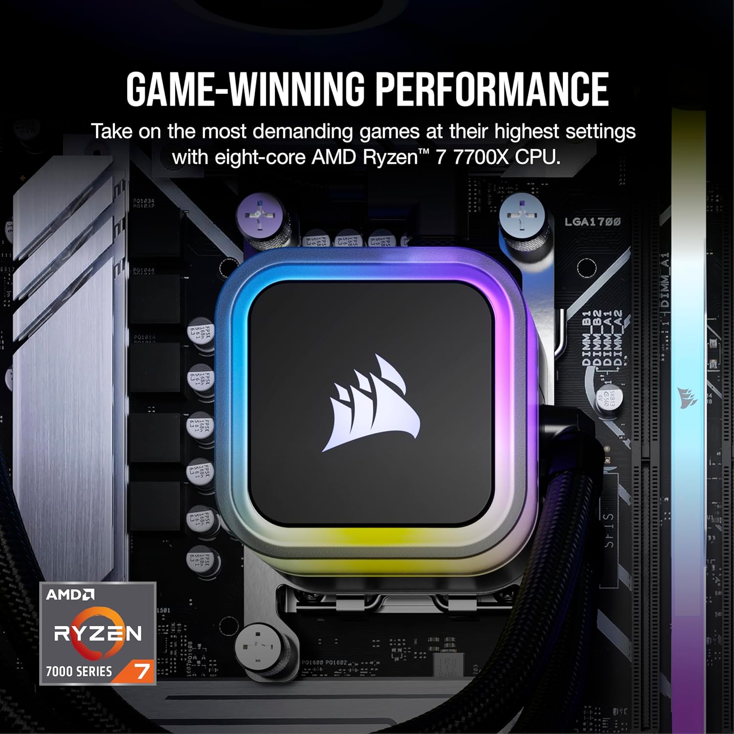 Step up your game with a CORSAIR VENGEANCE a7300 Series Gaming PC, powered by an AMD Ryzen 7000 Series CPU, NVIDIA GeForce RTX 40 Series graphics, and CORSAIR VENGEANCE RGB DDR5 Memory. Dynamic RGB lighting brilliantly illuminates the system, with powerful CORSAIR iCUE software to control lighting, fan and pump speeds, and more. The VENGEANCE a7300 Series is cooled by an H100i RGB ELITE liquid CPU cooler and six SP RGB ELITE fans with AirGuide technology for concentrated airflow. Equipped with a high-speed M.2 NVMe SSD, housed in a roomy CORSAIR 4000D AIRFLOW mid-tower case, and easily upgradeable thanks to a standard ATX form-factor, this is everything you need to game with a VENGEANCE.