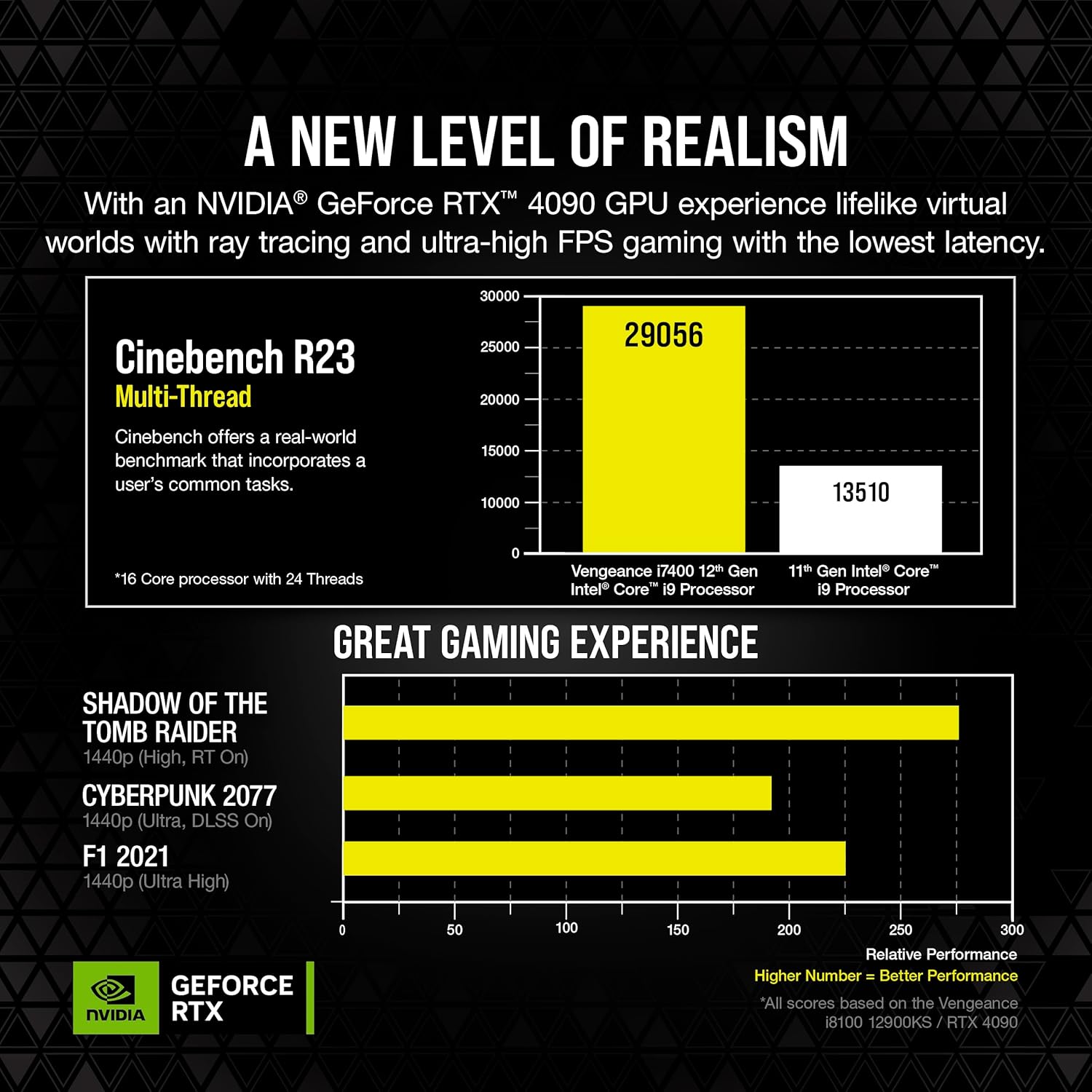 Step up your game with a CORSAIR VENGEANCE i8100 Series Gaming PC, powered by a 12th Gen Intel® Core™ processor, NVIDIA® GeForce RTX™ 40-Series graphics, and CORSAIR DOMINATOR PLATINUM RGB DDR5 memory. Dynamic RGB lighting brilliantly illuminates the system, with powerful CORSAIR iCUE software to control lighting, fan and pump speeds, and more. The VENGEANCE i8100 Series is cooled by an H150i ELITE liquid CPU cooler and seven LL RGB fans for concentrated airflow. Equipped with a high-speed M.2 NVMe SSD, housed in a roomy CORSAIR 5000T mid-tower ATX case, and easily upgradeable thanks to a standard ATX form-factor, this is everything you need to game with a VENGEANCE.