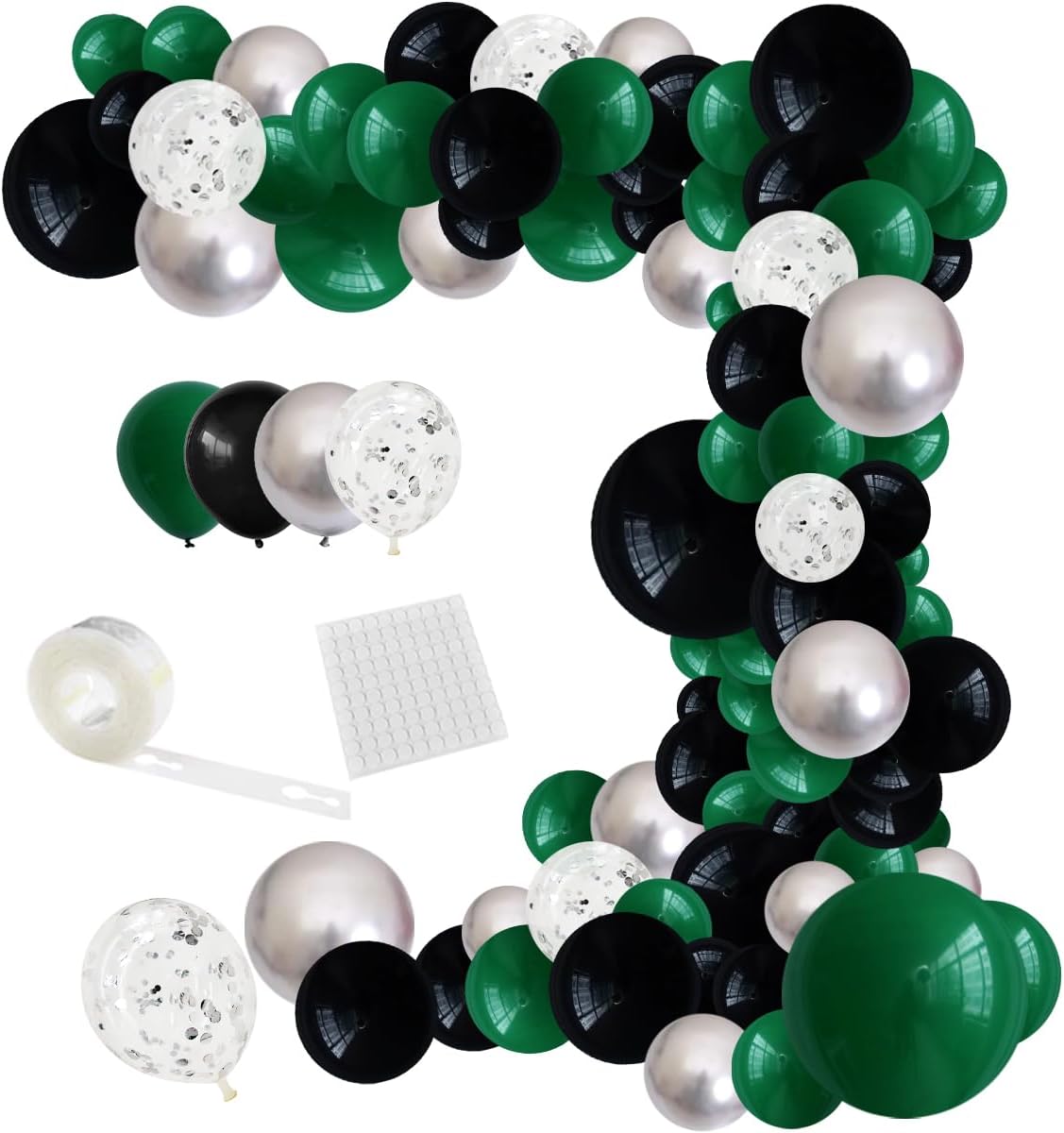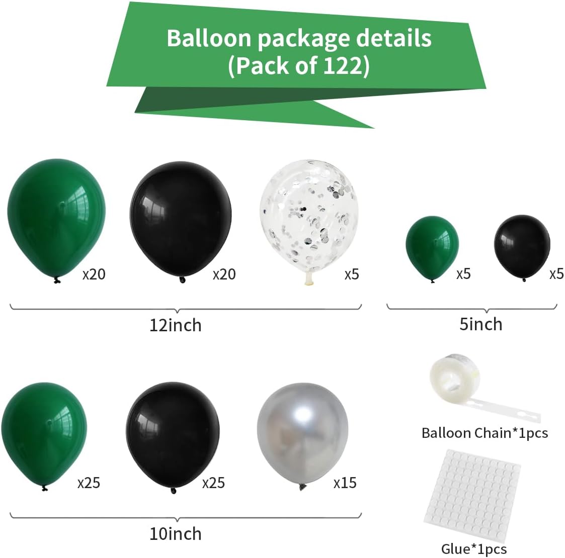 DARK GREEN BLACK SILVER BALLOONS GARLAND KIT : 45pcs 12inch balloon(dark green, black, silver confetti), 65pcs 10inch balloon(dark green, Black, metallic silver), 10pcs 5inch balloon(dark green, black), 1pcs double-sideed glue sticker(100 dots), 1roll of double-hole balloon chain(16 feet).