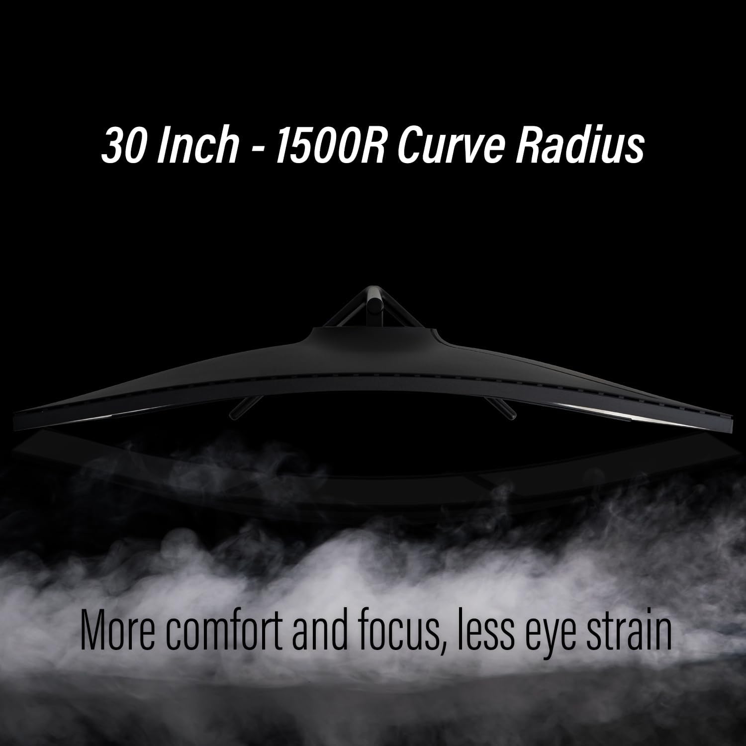 Panel Size: 30” Panel Backlight: E-LED Aspect Ratio: 21:9 Resolution: 2560 x 1080 Bezel: None Curve Radius: 1500R Color Saturation: NTSC: 90% | DCI-P3: 95% | SRGB: 99% | Adobe RGB: 84% Brightness: ≥ 250nit Contrast Ratio: 3000:1 Panel Response Time: w/o OD: 20ms | w/ 7ms OD | MPRT: 1ms Connectivity: HDMI 1.4: 2 (AdaptiveSync Range: 48-75 Hz) | HDMI 2.0: 1 (AdaptiveSync Range: 48-180 Hz) | DP 1.2: 1 (AdaptiveSync Range: 48-200 Hz) Tilt: -5˚±2˚~20˚±2˚ Power Consumption: 48W, 55W Max Dimensions: With Stand: 27.6” x 15.7” x 7.8” | Without Stand: 27.6” x 12.5” x 4.8
