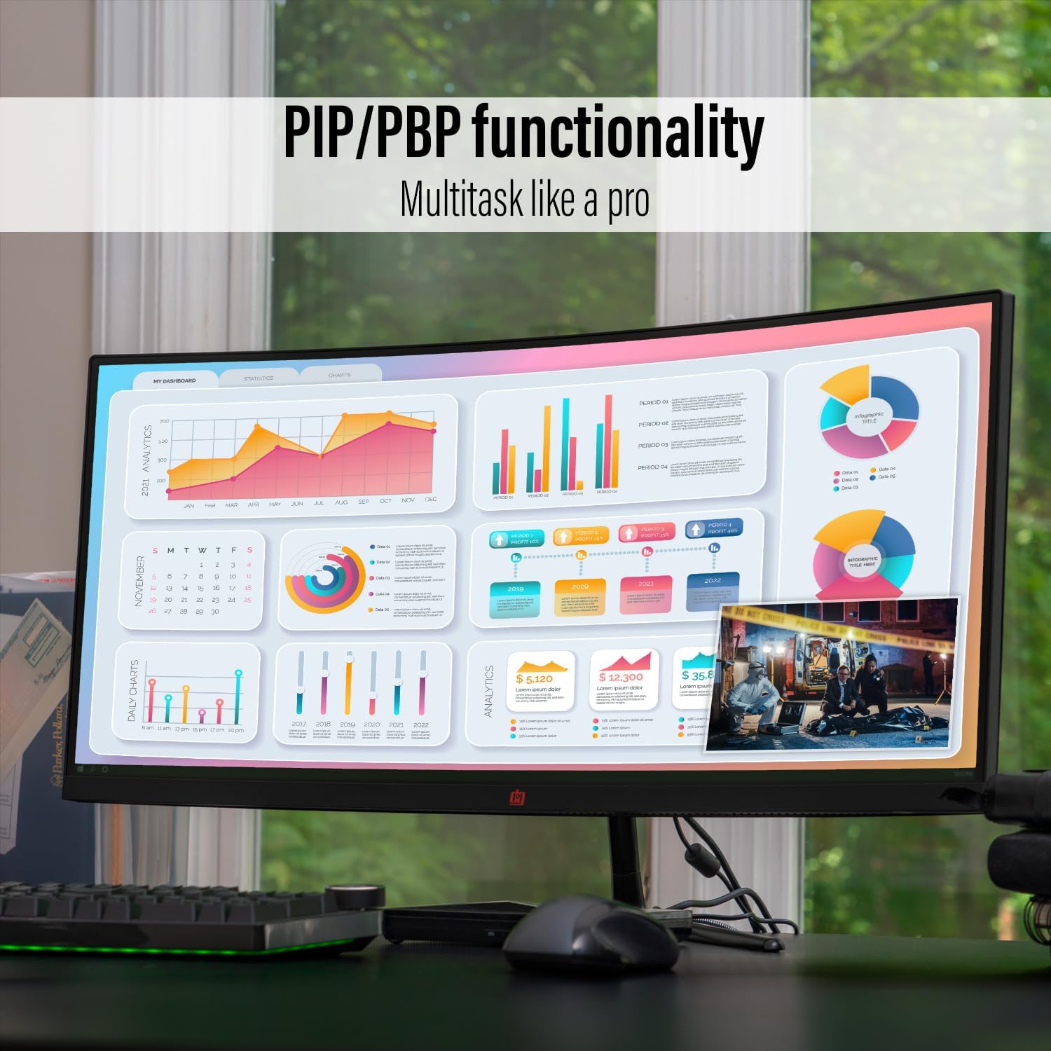 Enjoy colorful crisp 2560×1080 picture quality Blazing fast 200 Hz refresh rate, 1ms response Curved screen improves comfort and productivity Use for professional work and for fun Blue light and gaming modes included Picture-in-picture and picture-by-picture modes Over Drive Ability
