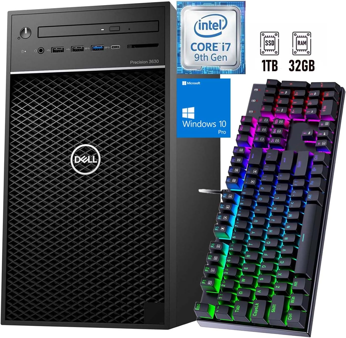 MAIN FEATURES:Brand: DellProduct Type: Desktop Mini TowerMemory Type:DDR4Memory Size: 32GBPROCESSOR SPECIFICATIONS:CPU Type: Intel Core i5 9th GenerationCPU Model: Core i7-9700CPU Frequency: 3GHzRPM: 4.7GHzStandard CPU Quantity: 1pcProcess: 14nmCPU Core: 8 coresCPU Threads: 8 threadsBOX INCLUDES:– Dell Optiplex 3630 MINI TOWER RENEWED-AMD Radeon RX 550 Graphics Card– RGB Keyboard– MouseI/O INTERFACES:Front: 2x USB 2.0, Type A; 1x USB 3.1, Type A (5 Gb); 1x USB 3.1, Type A (10 Gb); 1x Universal Audio JackInternal: 1 USB 3.0 port; 4 SATA 6 Gb/s portsRear: 2x USB 2.0, Type A (SmartPower supported); 4x USB 3.1, Type A (5 Gb); 1x PS2 keyboard; 1x PS2 mouse; 2x DisplayPort ports; 1x optional port (VGA, HDMI 2.0, DP++ 1.2, Type C [DP-Alt Mode supported]) 1 RJ45 network interface; 1 serial port; 1 universal audio jack