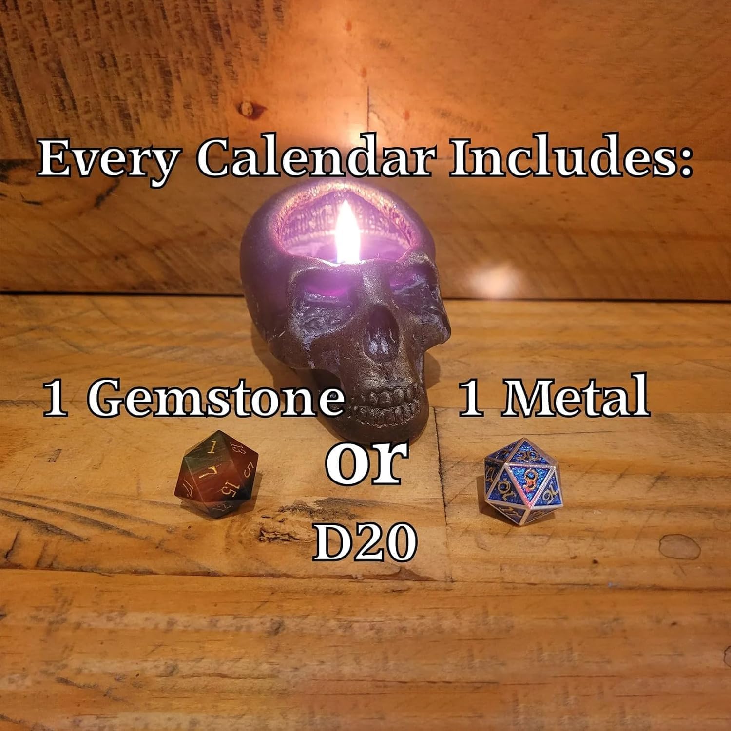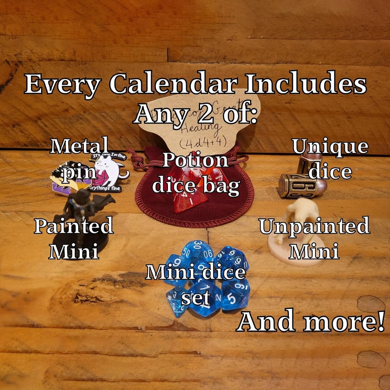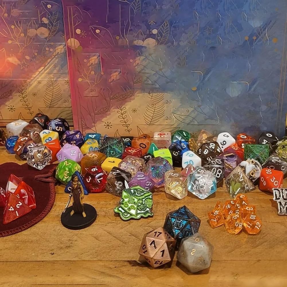 📦【Set includes】Each calendar contains:21 individual dice (a total of 3 polyhedral styles, which are mixed randomly) + 2 special gifts (randomly chosen painted and unpainted miniatures, pin badges, unique dice, potion dice bags , miniature dice and more)+1 Christmas gift (randomly chosen between a gemstone or metal d20).