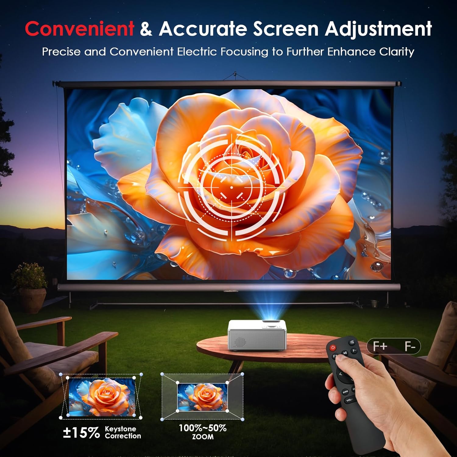 【Electric Focus】JOWLRUK portable projector is an innovative product, and from now on the focus can be controlled by remote. By controlling the F+ or F- button on the top of the remote control, you can get a clear image accurately within 2s. No longer need to turn the focus ring manually, greatly simplifying the operation process.