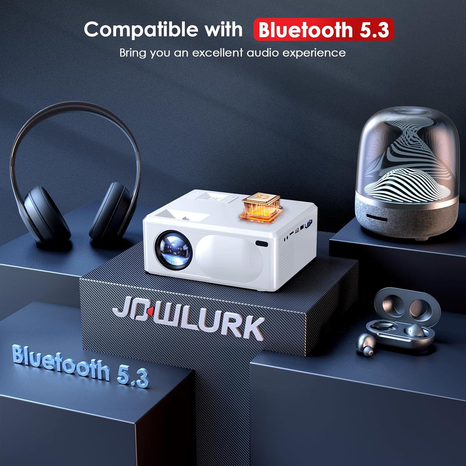 【5G WiFi & Bluetooth 5.3】JOWLURK projector with WiFi and Bluetooth integrates Bluetooth 5.3 and 5G WiFi for efficient transmission, realizing stable and high-speed device connection. With the built-in dual-band Wi-Fi (2.4GHz/5GHz) function, users can easily project content from smartphones, tablets and other devices to the big screen, whether it’s a high-definition movie or an office presentation can be synchronized instantly.