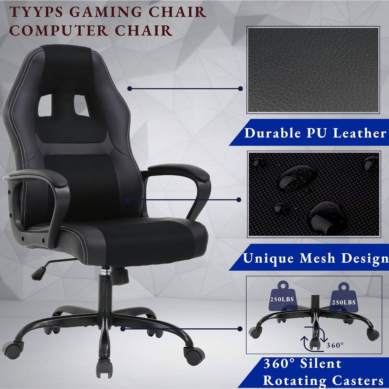【360-Degree Swivel And Casters】:Our gaming chair has a heavy-duty nylon base with 360-degree swivel and nylon smooth-rolling casters, great stability, and mobility,and offering a versatile range of motion,the executive chair swivels 360 degrees for multi-tasking convenience,and its durable casters allow for smooth-rolling mobility from one area of your office to another or to the meeting room and back again.