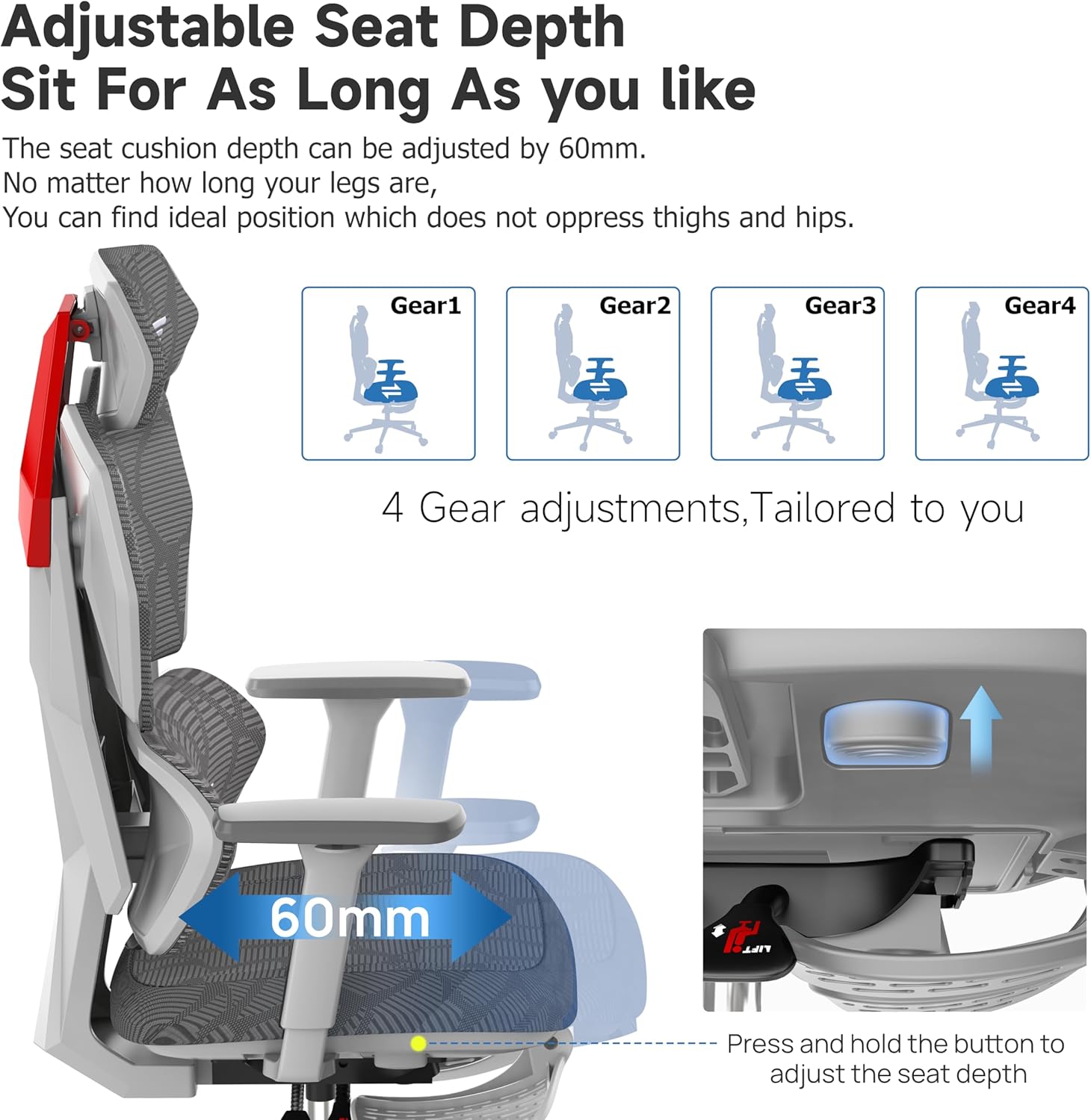 【MULTIPLE ADJUSTMENTS】According to the natural curve of the human spine, our adjustable lumbar support can adaptive rotate 10 degrees, glide up & down by 60mm and be locked at 3 gears. The chair seat cushion can be adjusted at 4 gears, glided back and forth about 60mm to find the most suitable sitting position according to height and thigh length. Adjustbable headrest move up & down or rotate freely 45°. Our chair back can tilt freely between 90°-135° so that you can freely ease into work or rest.