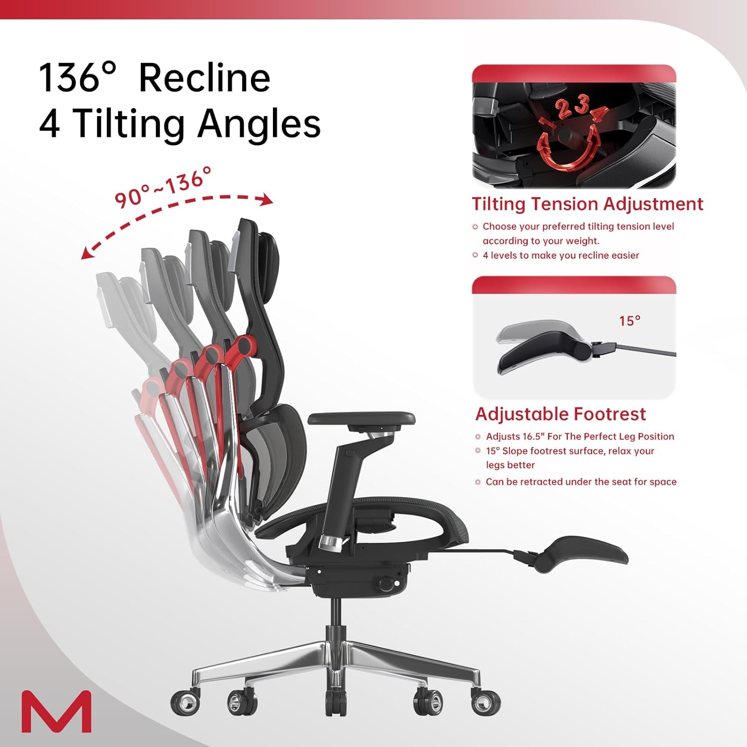 136° Tilting Design for Premium Relaxing : This office chair features a 136° recline angle with 4-level recline lock, allowing you to choose the perfect angle for relaxation or focus. Plus, adjust the tension of the tilt to match your personal comfort preference, ensuring every moment spent in the chair is both supportive and relaxing. Our patented 136-degree tilting design enables you to have the best experience at work or at leisure. The stable and sturdy mechanism and reclining support ensure that you can enjoy relaxation and safety at any reclining Angle. Choose this chair and enjoy the ultimate sitting experience!