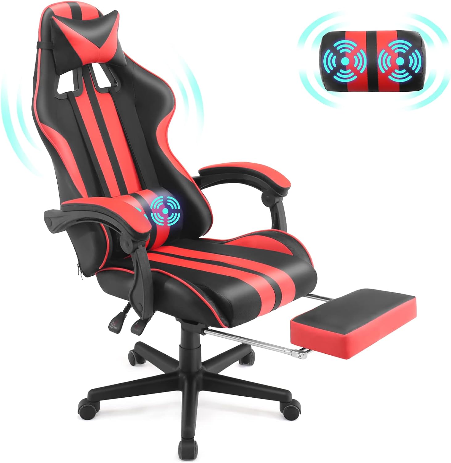 [Versatile Functionality]-This computer gaming chair is not just for racing but also an enhanced PC gaming chair. It features a reclining backrest adjustable from 90° to 135°, a 360° swivel mechanism, 100mm seat height adjustment, a retractable footrest, a removable and adjustable headrest pillow, and a USB massage lumbar cushion for added support.