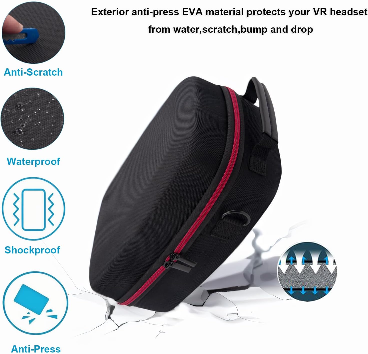 SPLASH AND WATERPROOF – The outer shell of quest 3 travel case is crafted from splash-proof EVA material, complemented by waterproof zippers, ensuring comprehensive protection against water damage and environmental hazards during travel.