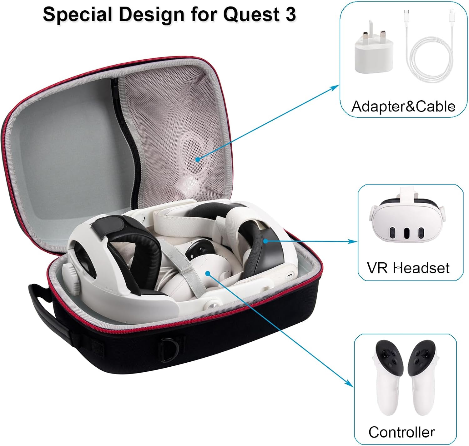 accommodates your Quest 3 headset, controllers, charger, charging cable, and batteriesaccommodates your Quest 3 headset, controllers, charger, charging cable, and batteries