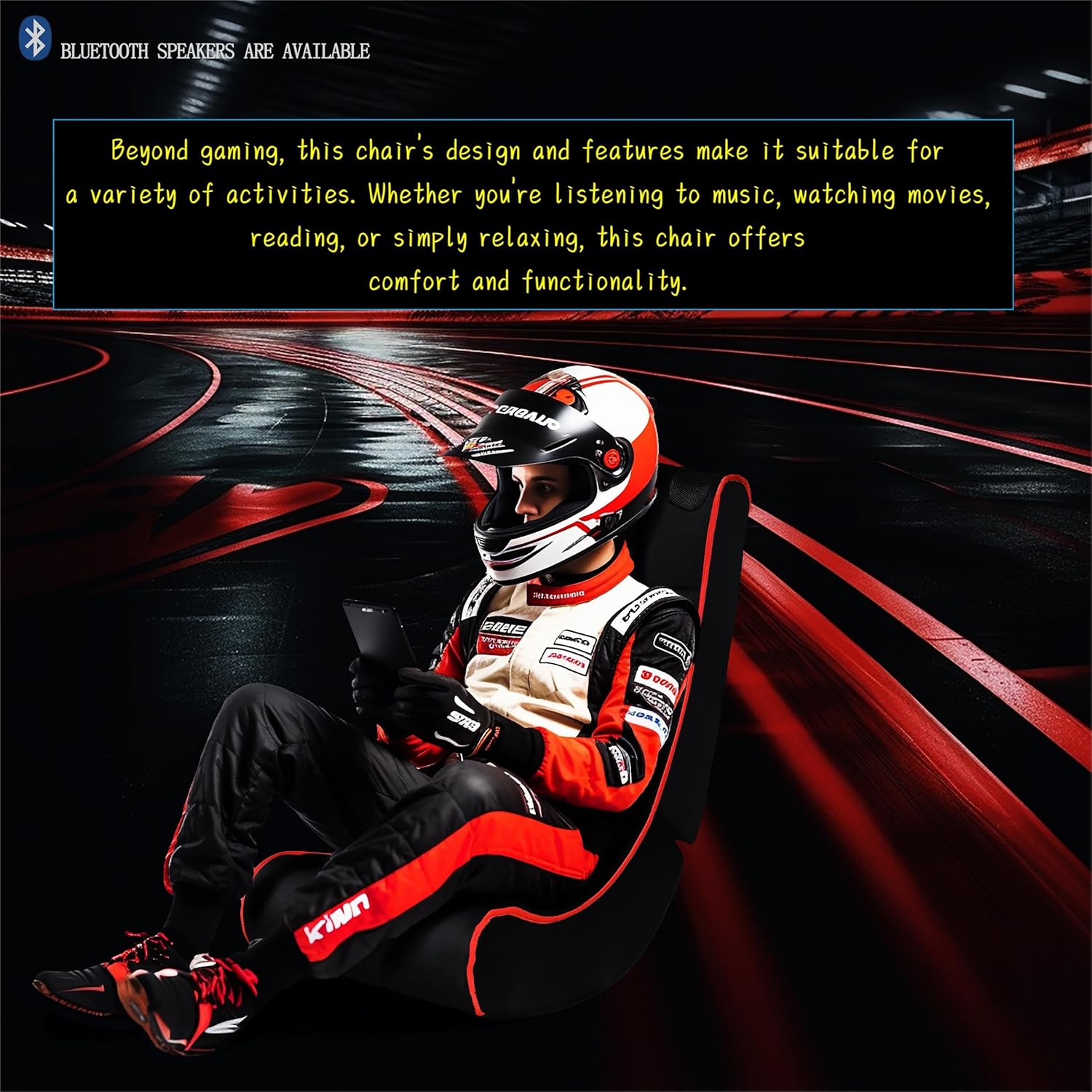 Ergonomic foldable design for easy storageComfortable polyester cover with foam paddingDual 3″ built-in speakers for immersive soundBluetooth and 3.5mm connectivity optionsCompatible with all gaming consolesVersatile use for gaming, music, and relaxation