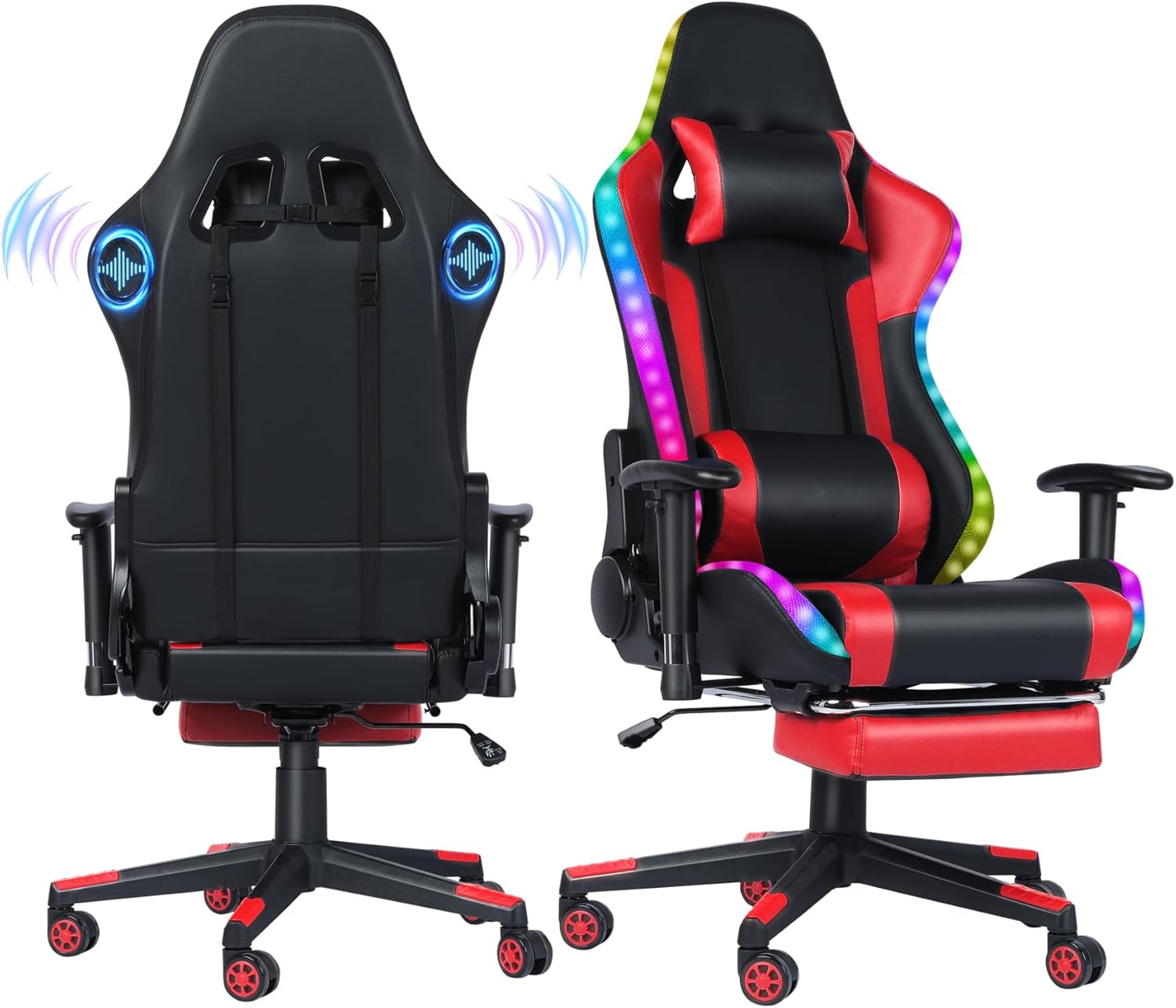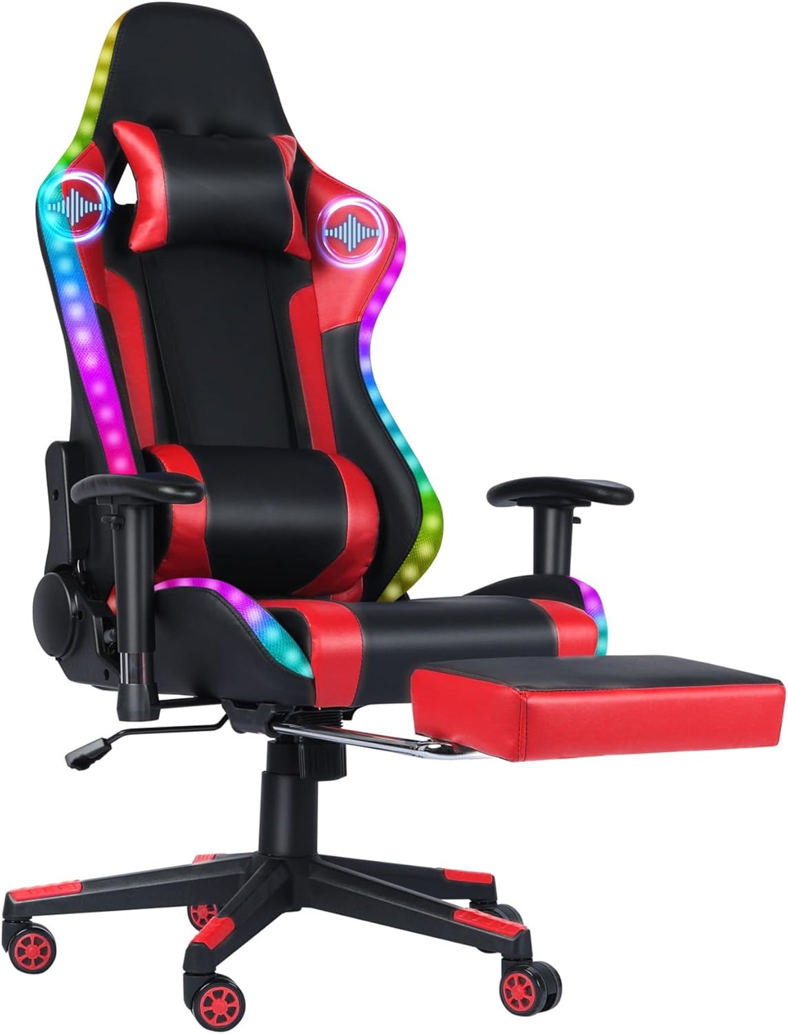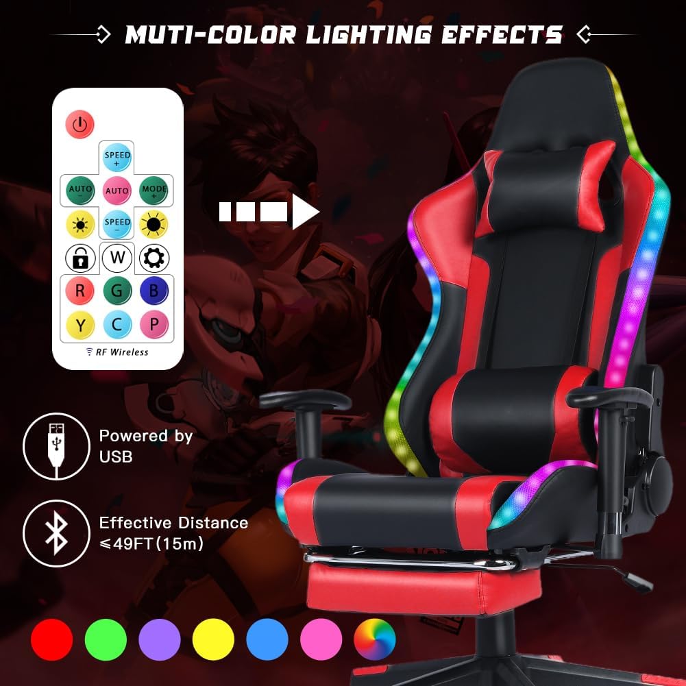 Gaming Chair with Speakers, Video Game Chair with RGB LED Lights, Footrest, Ergonomic Racing Computer Gaming Recliner Chair Swivel E-Sports Chair with Lumbar Support Headrest Armrest, Red