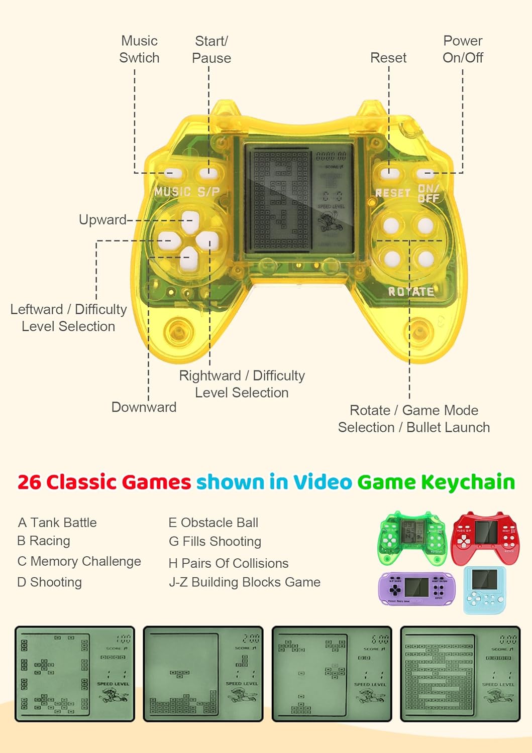 【Nice Gifts for Kids】 Kids love games and challenges! This mini video gamepad keychain set is an ideal gift for both boys and girls. Create more fun for your babies at video game parties, family gatherings, or birthday parties! Reach out to us if you have any questions. We’re always there for you