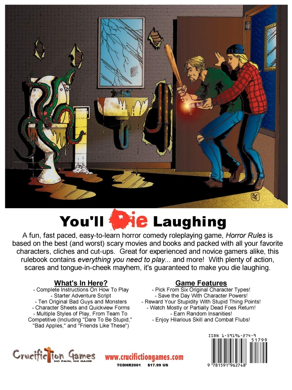 A fun, fast paced, easy-to-learn horror-comedy roleplaying game, Horror Rules is a great way to lose your marbles (or your life) and keep your sense of humor! Based on popular horror movies such as Tremors, The Evil Dead and 8-Legged Freaks and packed with all your favorite characters, cliches and cut-ups, it’s great for experienced and novice gamers alike. Liven up any party or just kill a few hours with your friends. Even non-gamers will find it a fun read and an excellent addition to any horror collection. The basic rulebook is packed with cool artwork, sample Bad Guys, Character Sheets, a free adventure and 100pgs of scare-your-pants-off fun… everything you need to play and more! With plenty of action, scares and tongue-in-cheek fun, it’s guaranteed to make you DIE laughing.