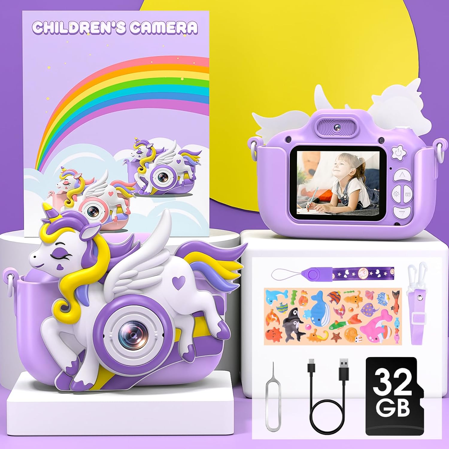 Multi-function & 32GB High Capacity: In addition to taking photo, recording and playback, the upgrade new digital camera for kids comes with more functions, such as burst shooting, time shooting, 28 filter effect, puzzle games to inspire children’s imagination and creativity! Extra 32G card allows to store thousands of photos. No need to worry about running out of storage anymore!