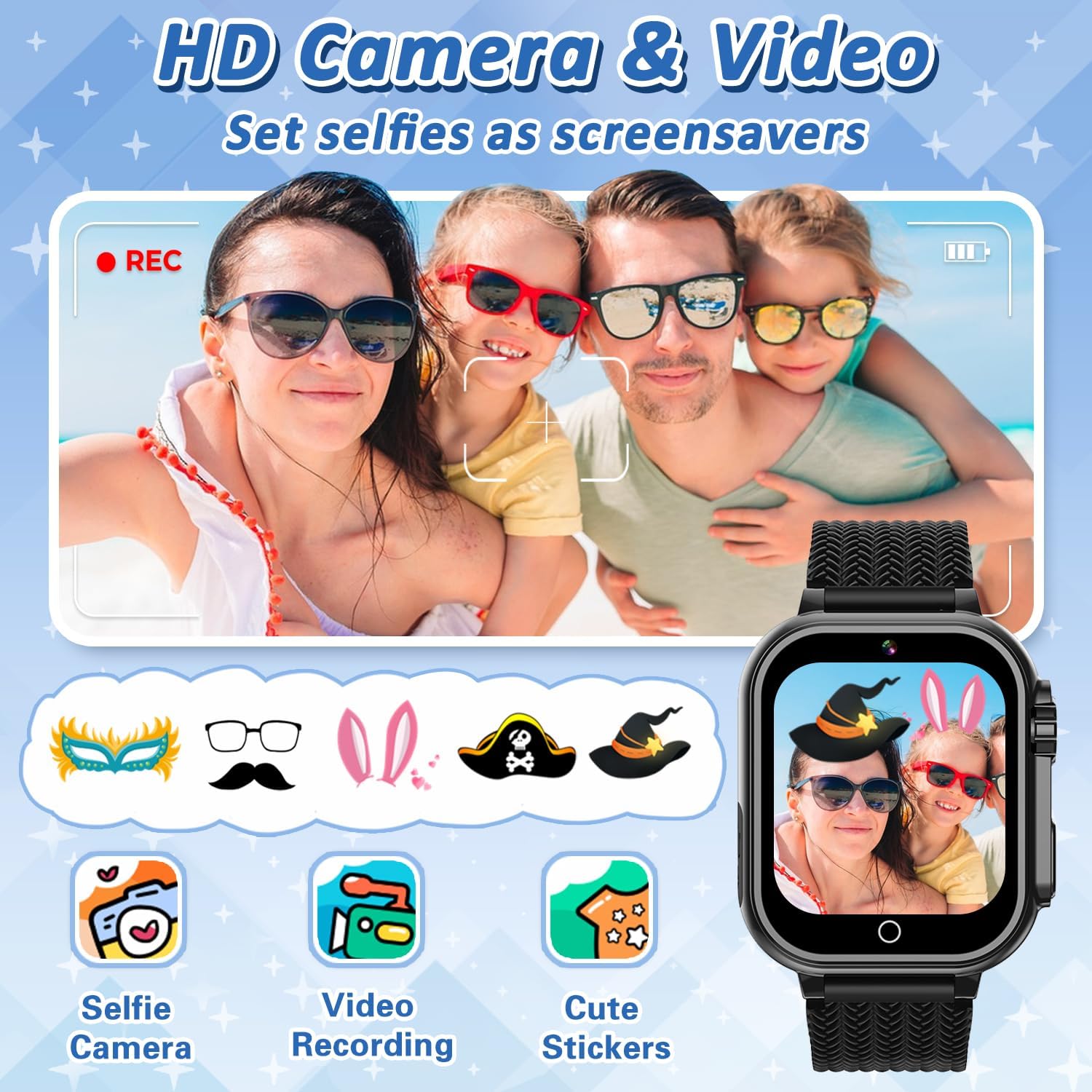 👍【HD Selfie Camera】The kids touchscreen smartwatch has HD camera and video support. Children can take photos and capture record every wonderful moment in their lives. Built-in photo stickers bring more fun for kids to take photos. Kids watch is capable of store 15000+ HD photos or 8+ hours video.