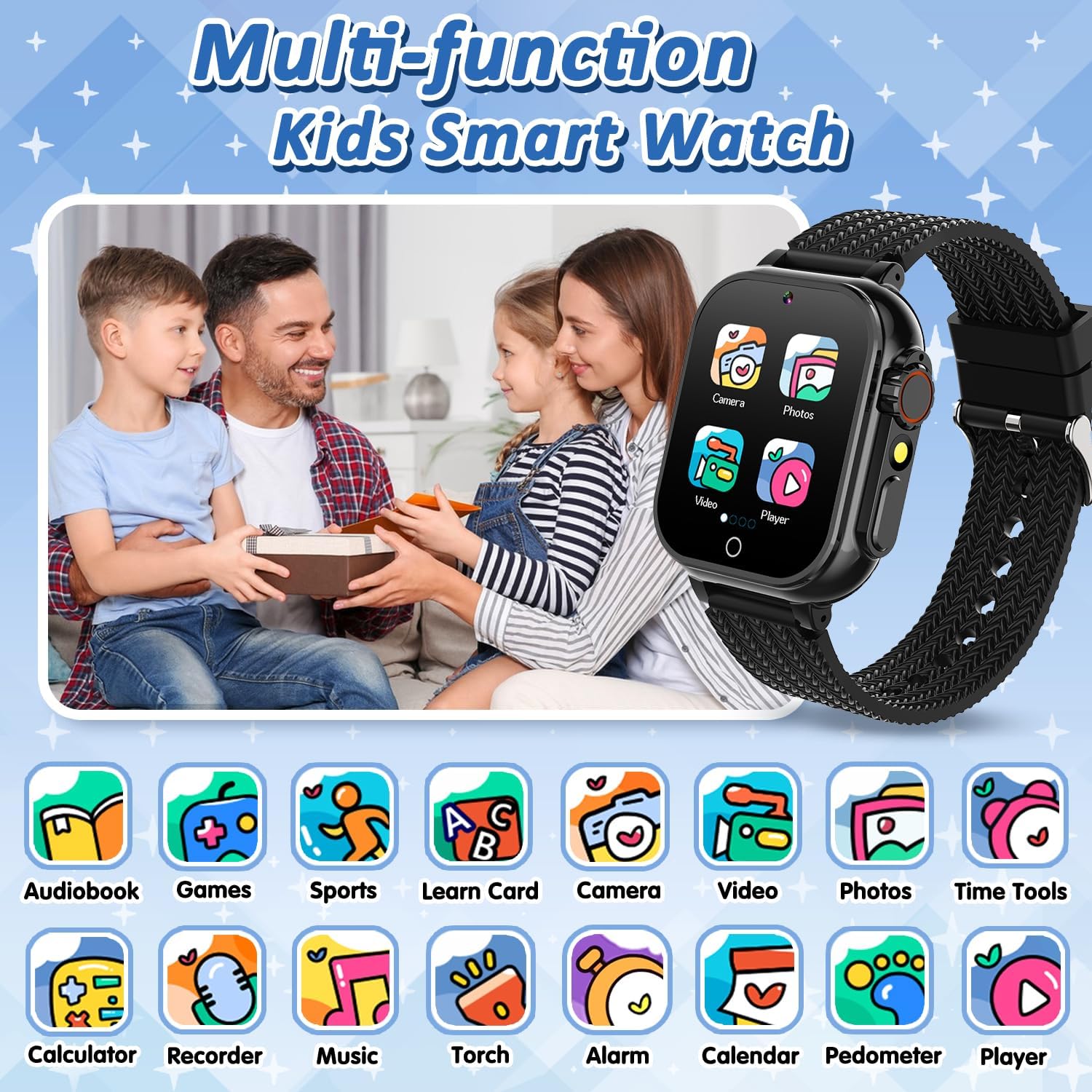 👍【Best Smart Watch for Kids】2024 Kids smart watch with selfie-cam, 32 games, MP3 player, audiobooks, voice recorder, pedometer, flashlight, alarm, habit tracking, , stopwatch, 100 learn card, calculator, theme, screensaver select, parental control, silent profile, time format, volume, etc. They can help kids stay organized, track their activities, make learning fun with educational games and apps.